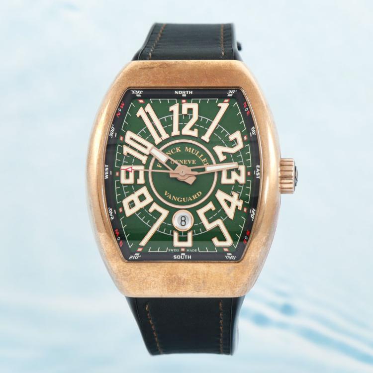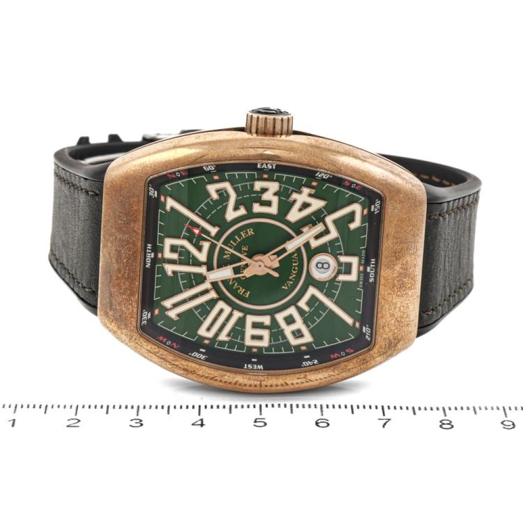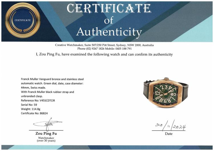 Franck Muller Vanguard bronze and stainless steel automatic mens watch. Green dial, date, case diameter: 44mm, adjustable max wrist size: 21cm, Swiss made. Ref #V45SCDTCIR. With Franck Muller black rubber strap and Pulsar clasp. With Certificate of Authenticity and Franck Muller box. 3 month FSA warranty (Pre-owned)