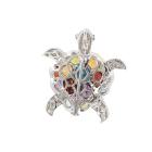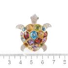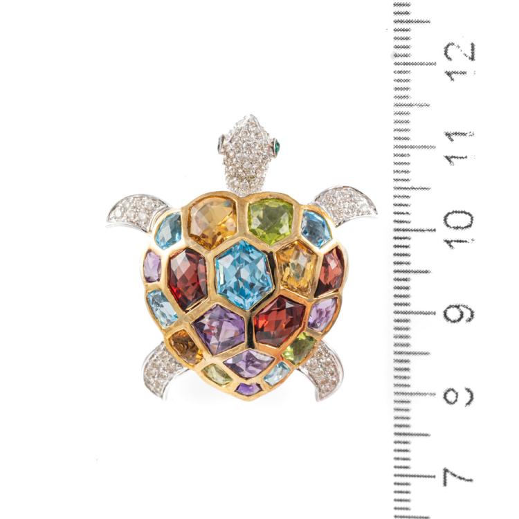Turtle designed brooch/pendant with fancy cut natural Amethyst, Citrine, red Garnet, Peridot & blue Topaz totalling 8.60ct, 2 round natural Emeralds totalling 0.03ct and round Diamonds totalling 0.56ct (Estimated grading: J-K SI). 18ct white gold. Weight: 12.6g. (Pre-owned)