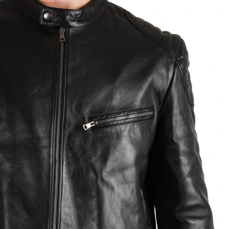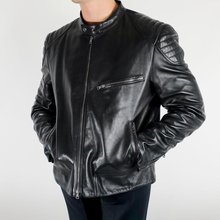 Gucci moto jacket crafted from soft Nappa leather and knit at the back in black. Featuring 2 side zipper pockets and a chest zipper pocket, stitched pattern on the shoulders, zippers on sleeves trim, stand collar and zippered closure at the front. Black fabric lined with a interior pocket. Size: 58 (First State Auctions approximate dimensions: Shoulder 52cm, Chest: 118cm, Length: 66cm). Accompanied by Gucci cloth hanger and dust bag. (Pre-owned)
