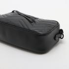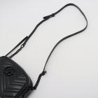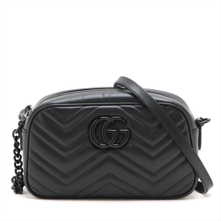 Gucci small GG Marmont All Black shoulder bag in black chevron quilted leather. Featuring black-toned hardware, double G hardware logo at front, and adjustable leather-chain shoulder strap. The zipper top opens to black textile lining interior with a patch pocket. Approximate dimensions: 24cm(L) x 14cm(H) x 7cm(D), 60cm shoulder drop height. Accompanied by a Gucci dustbag and box. With Entrupy Certificate of Authenticity. (Pre-owned)