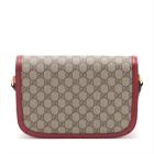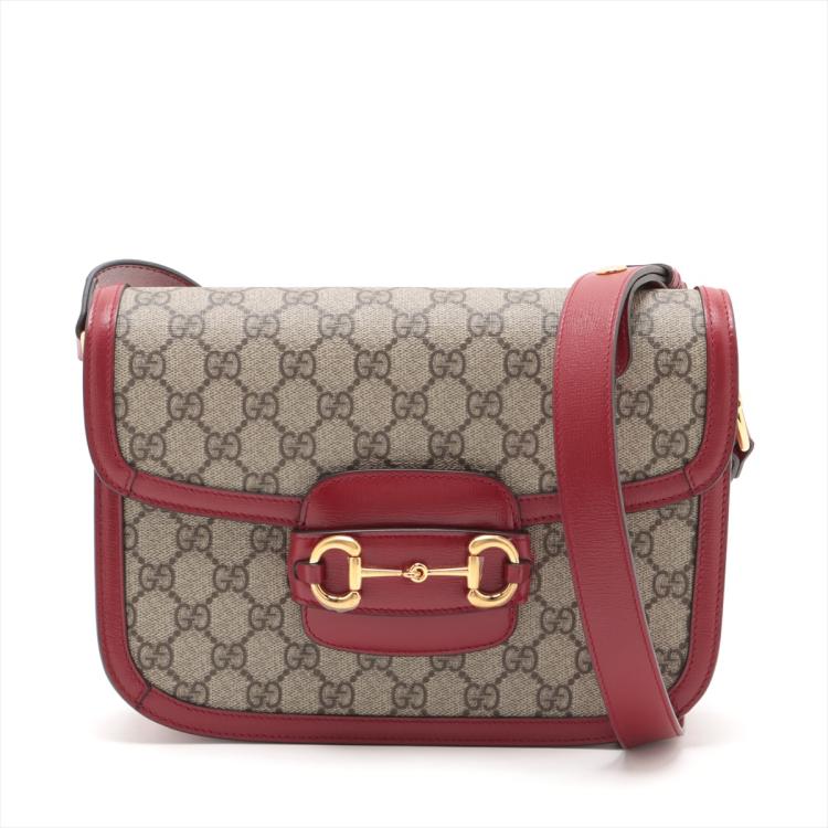 Gucci Horsebit 1955 medium shoulder bag in GG Supreme canvas, with red leather trim. Featuring gold-toned hardware, Horsebit detail at the front, and half Horsebit detail at sides. The flap opens to a beige microfibre interior with a zip pocket, and an exterior patch pocket. Approximate dimensions: 26cm(L) x 19cm(H) x 6cm(D), adjustable shoulder strap 45cm. Accompanied by Gucci dustbag and box. With Entrupy Certificate of Authenticity. (Pre-owned)
