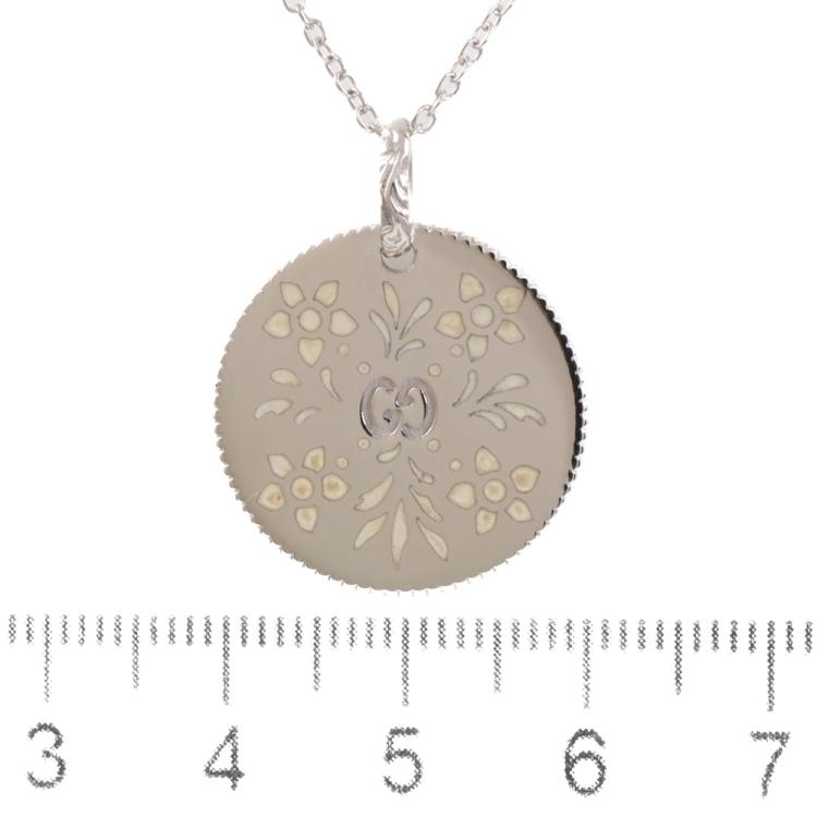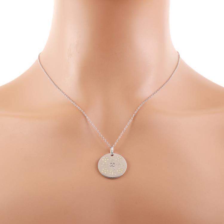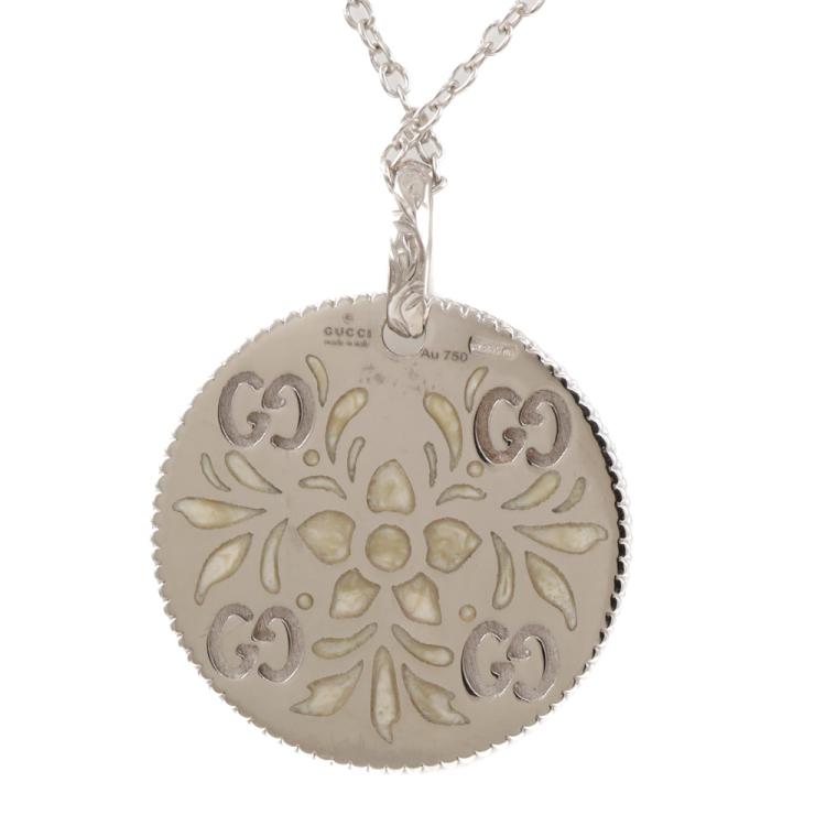 Gucci Icon Bloom pendant with enamelled motifs of diameter 20.7mm. Made in Italy. 18ct white gold with 49cm 18ct white gold adjustable chain. Weight: 7.6g. Gucci pouch and box. (Pre-owned)