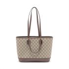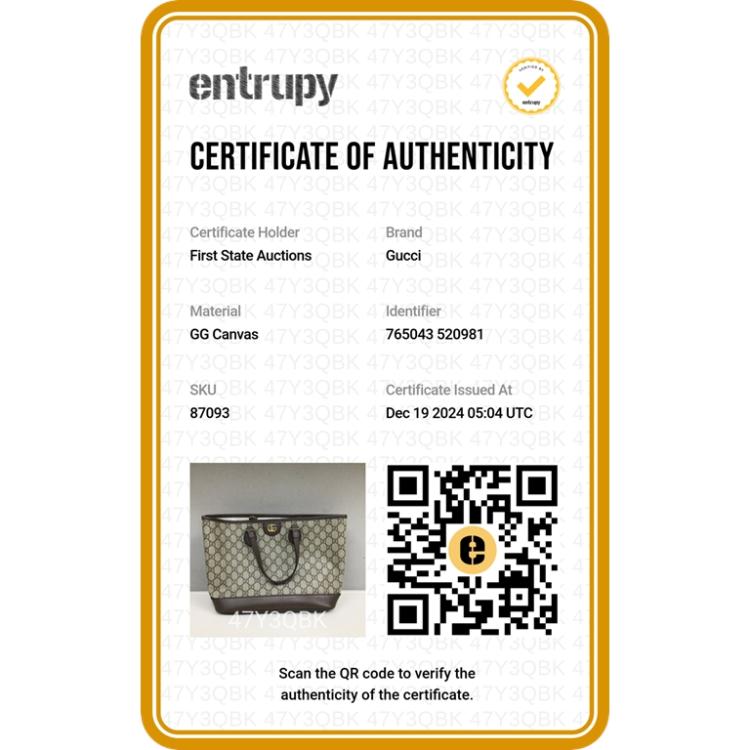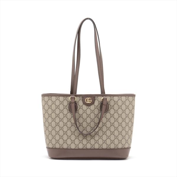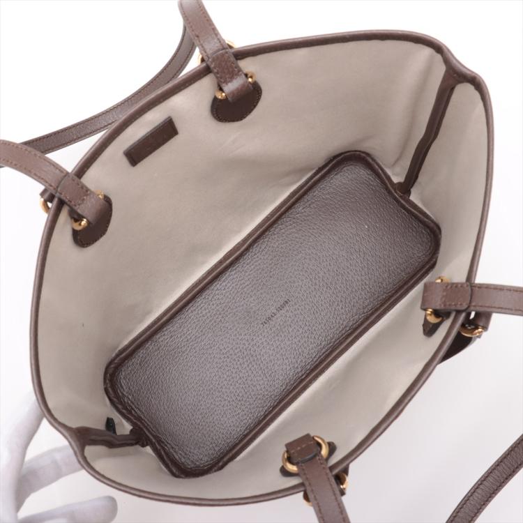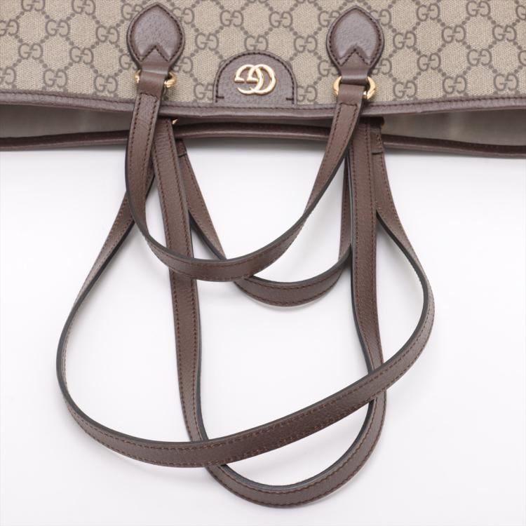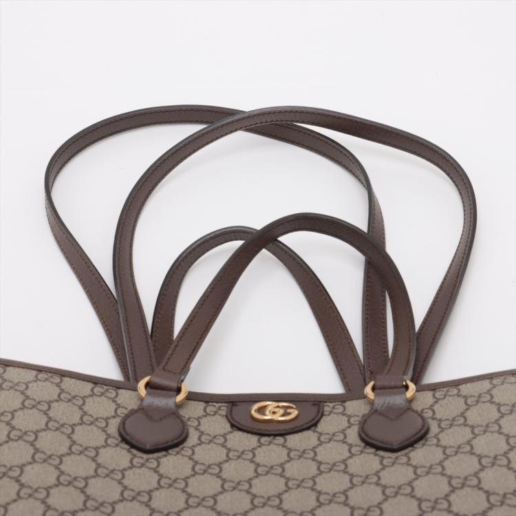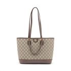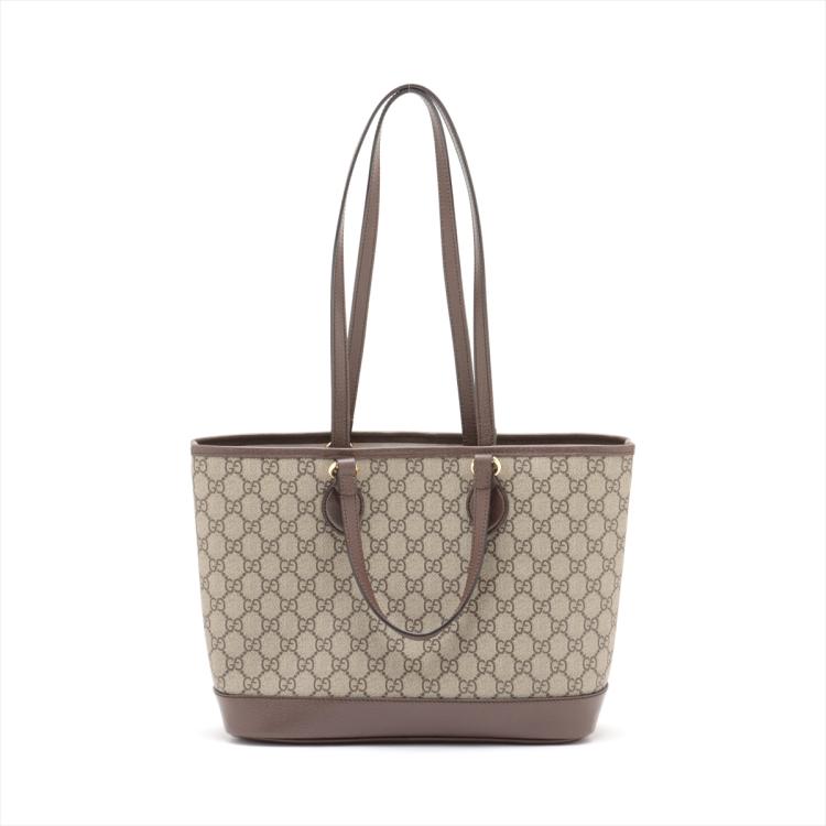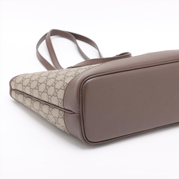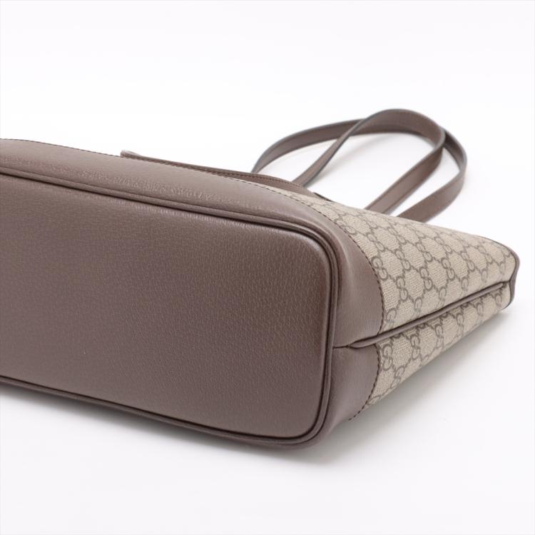 Gucci Ophidia small tote bag in beige and ebony GG Supreme canvas and with brown leather trim. Featuring gold hardware, dual flat handles and shoulder straps, double G logo detail at front. The open top reveals to cotton linen lining interior with leather bottom. Approx dimensions: 31cm(Base-W) x 25cm(H) x 13cm(D), 12cm handle drop and 28.5cm shoulder drop. Accompanied by Gucci dust bag. With Entrupy Certificate of Authenticity. (Pre-owned)