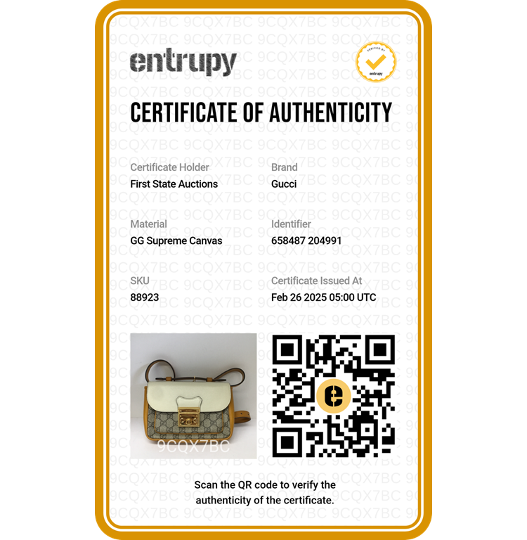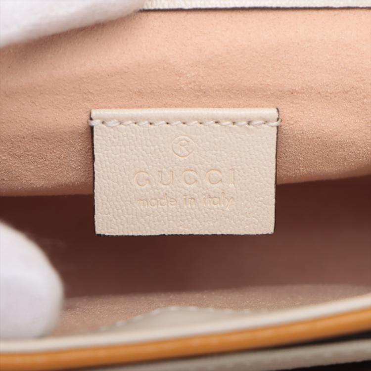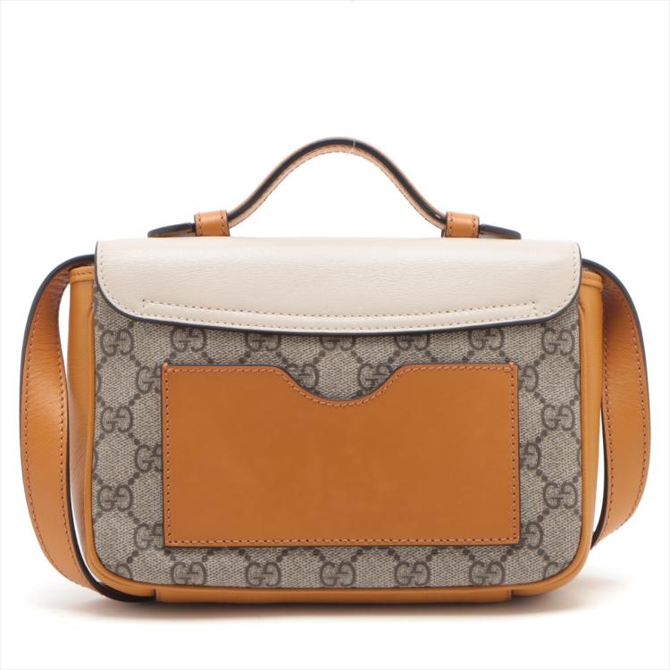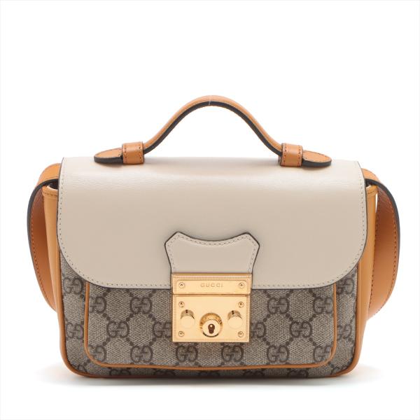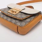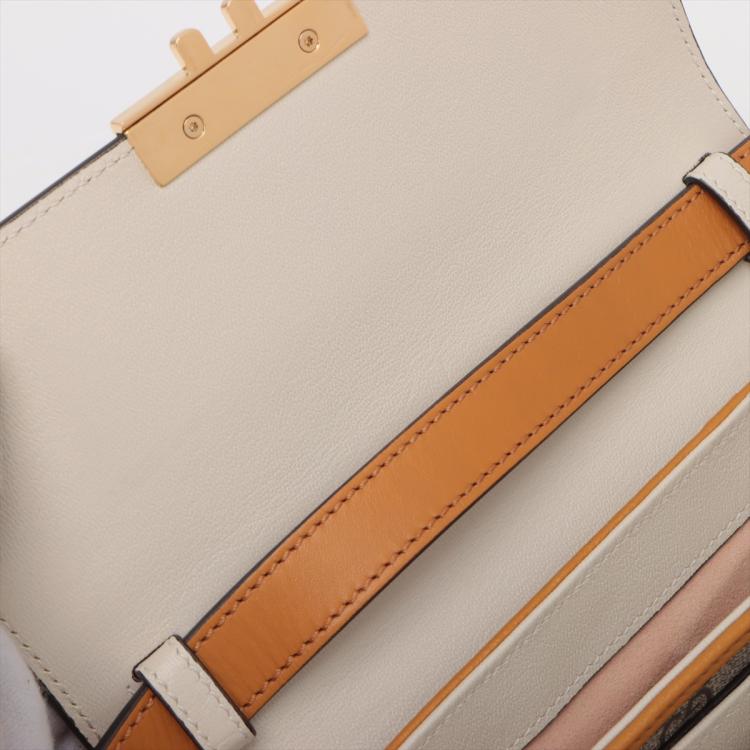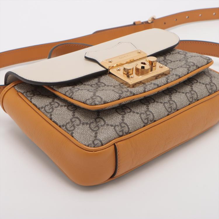 Gucci Padlock shoulder bag in GG Supreme canvas and orange & beige calfskin leather. Featuring orange leather trim, handle, and sides, gold-toned hardware, and exterior rear pocket. The push-lock closure on flap opens to a beige suede-lined main compartment and external pocket. Approx. dimensions: 20cm(L) x 15cm(H) x 5cm(D), handle drop 4cm, shoulder strap drop 55cm. Accompanied by keys in clochette, a Gucci dustbag. With Entrupy Certificate of Authenticity. (Pre-owned)