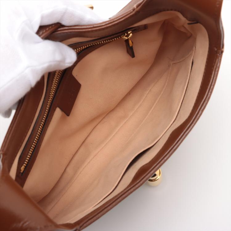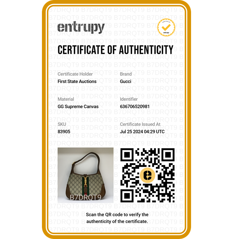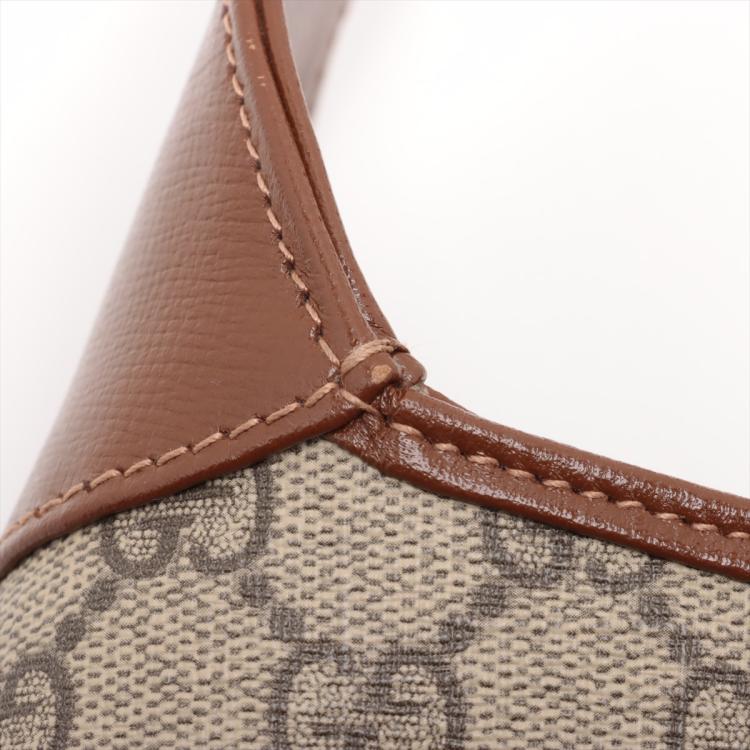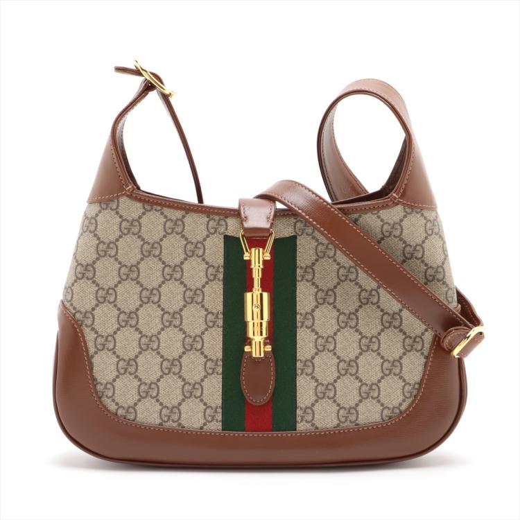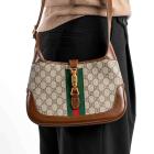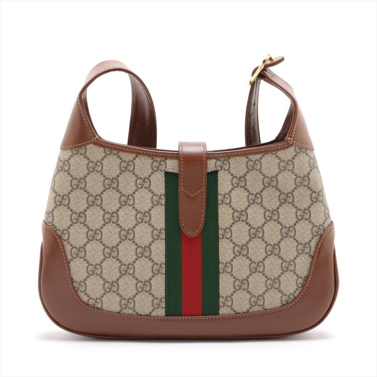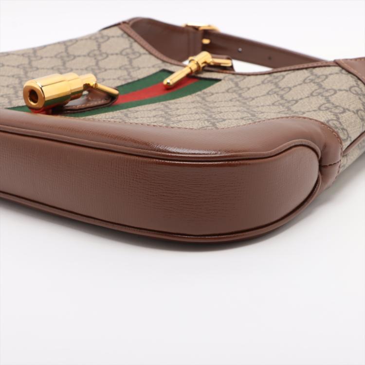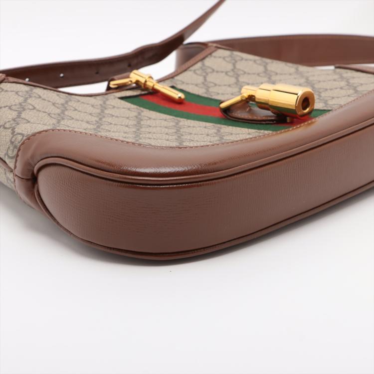 Gucci Jackie 1961 small shoulder bag in beige GG supreme canvas and brown leather trim. Featuring gold-toned hardware, green and red web details at front, and detachable shoulder strap extension. The piston closure opens to a beige suede lining with a zipper and patch pockets. Approximate dimensions: 28cm(L) x 19cm(H) x 3.5cm(D), 20cm handle drop, max strap with extension drop 57cm. With Entrupy Certificate of Authenticity. (Pre-owned)