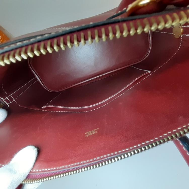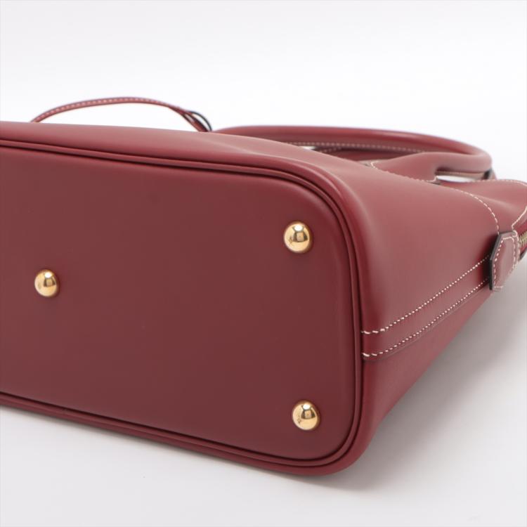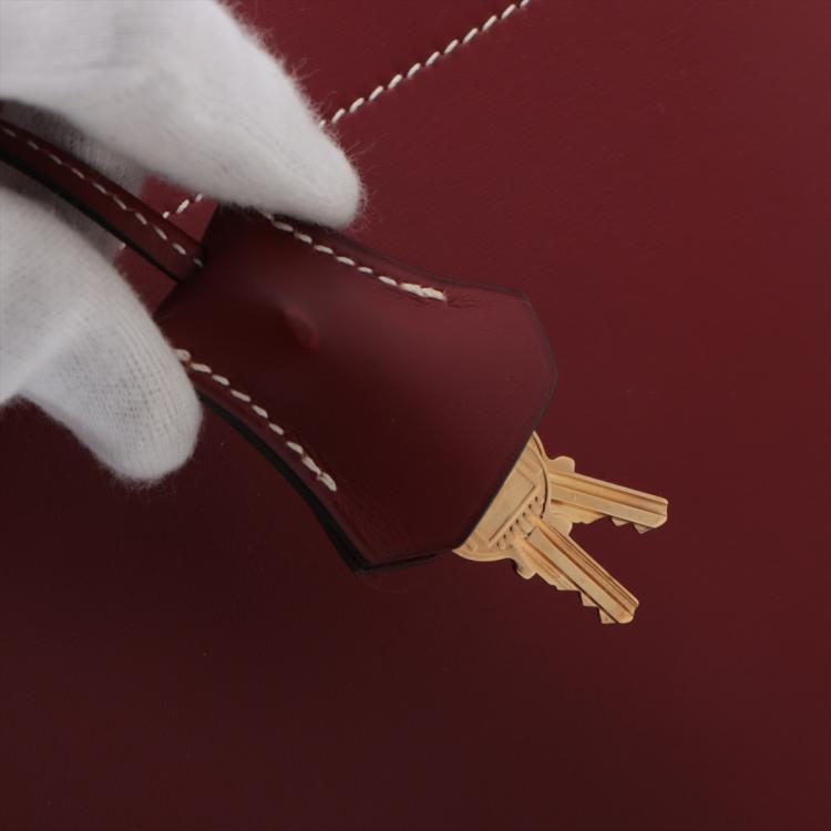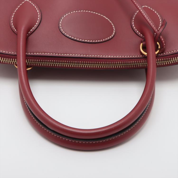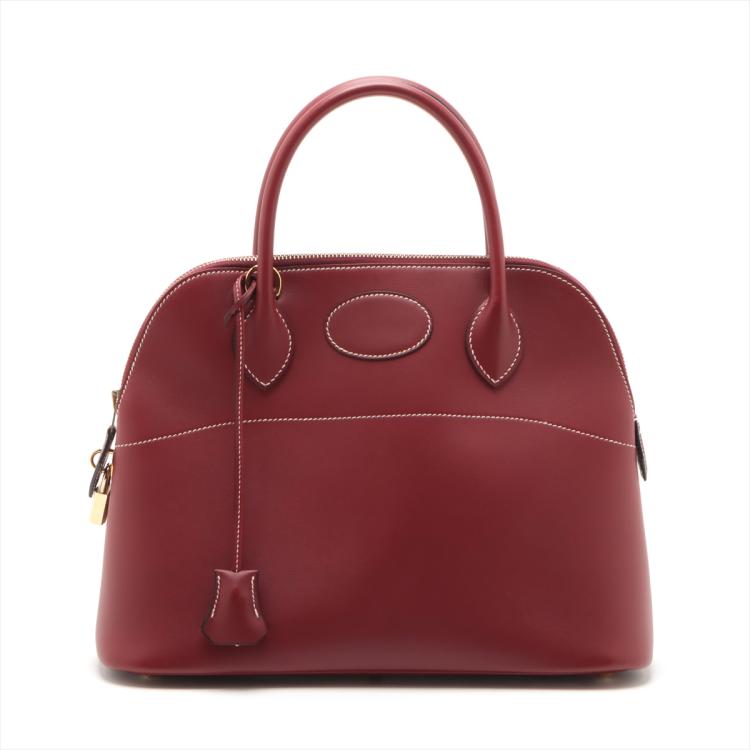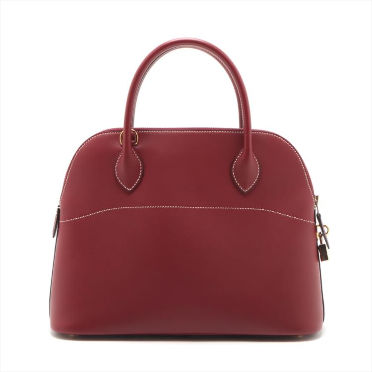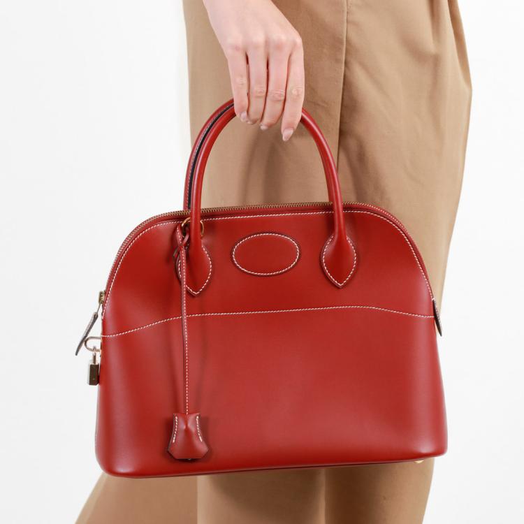 Hermès Bolide 31 handbag in Rouge H Box Calf leather. (square F: 2002). Featuring gold-toned hardware, double top handles, and padlock with two keys inside a clochette. The zipper top opens to a matching dark red smooth leather lining interior with a patch pocket. Approximate dimensions: 31.5cm(L) x 24.5cm(H) x 12.5cm(D), handle drop 10cm. Accompanied by a Hermès dustbag. (NOTE: shoulder strap NOT included.) With Entrupy Certificate of Authenticity. (Pre-owned)