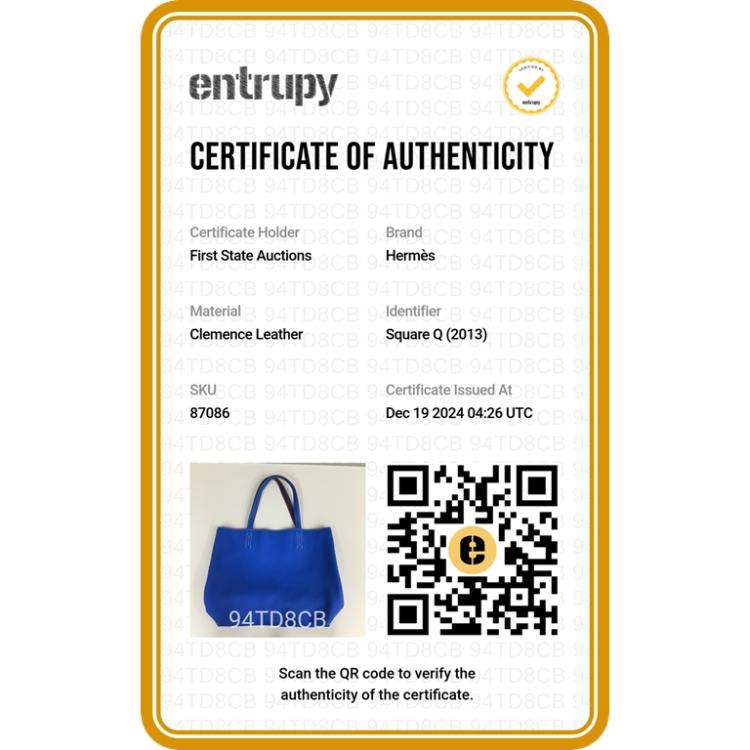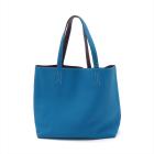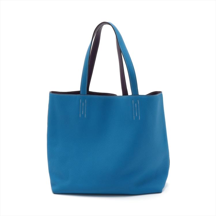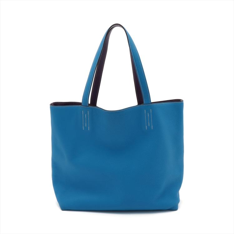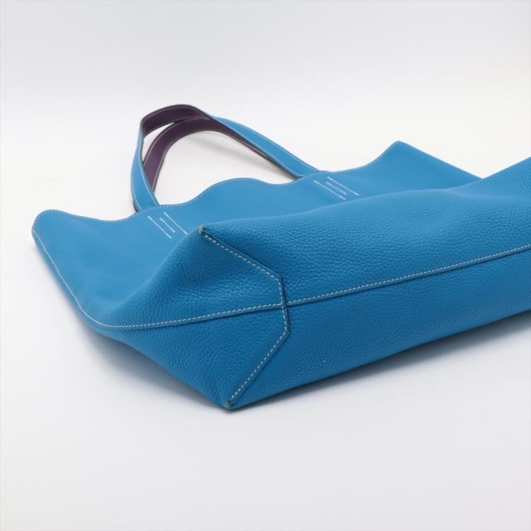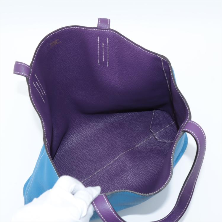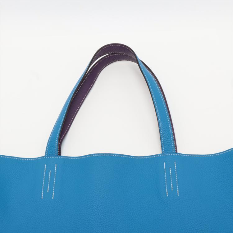 Hermes Double Sens 36 reversible tote in Taurillon Clemence leather (Q in square, circa: 2013). Featuring double leather handles, white stitches, open top. The bag is reversible with one side Ultra Violet and the reverse side Blue Hydra colour. Approximate dimensions: 36cm(L) x 32cm(H) x 12cm(D), 23cm handle drop. With Entrupy Certificate of Authenticity. (Pre-owned)