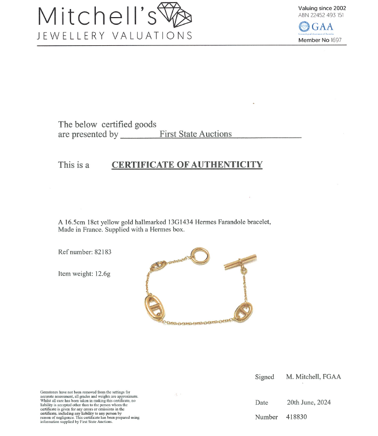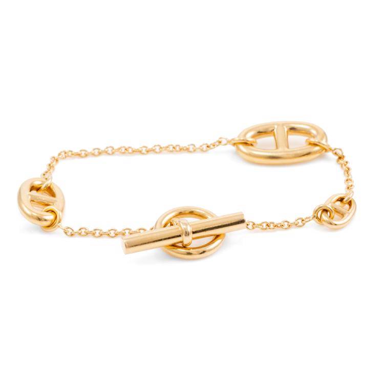 Hermes Farandole bracelet with 3 motifs. Motif size: 17 x 10.2mm, 14.1 x 8.7mm and 9.2 x 5.5mm. 18ct yellow gold. Length: 16.5cm. Made in France. Weight: 12.6g. With Certificate #418830. With Hermes box. (Pre-owned)