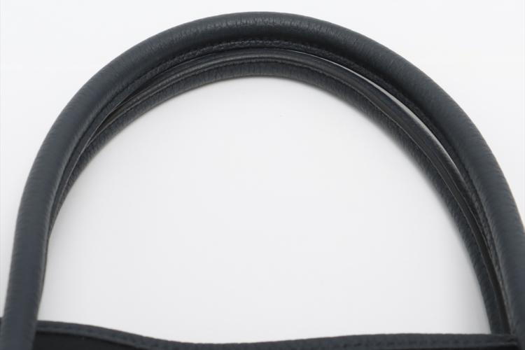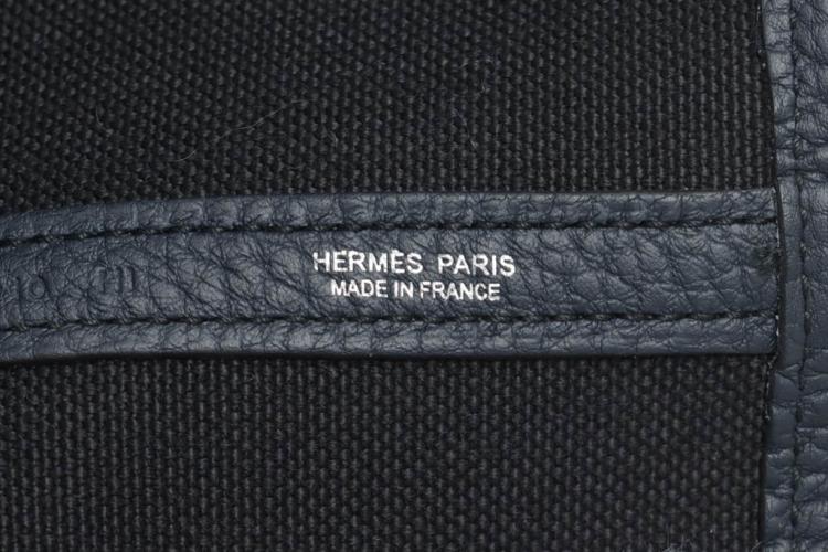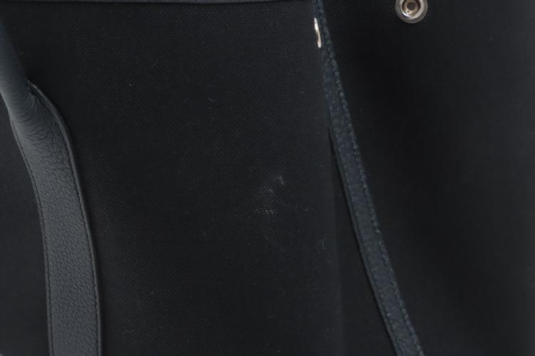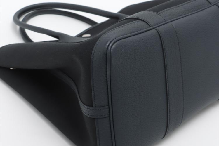 Hermès Garden Party 36 MM in navy blue Negonda leather and black Toile canvas ("Y", circa: 2020). The bag has rolled leather handles and is fitted with silver palladium hardware, featuring a monogram snap-button closure. The bag opens to a black fabric interior with a navy leather base to match its exterior. Approximate dimensions: 36cm(L) x 27cm(H) x 17.5cm(D). Accompanied with a Hermes dustbag. With Entrupy Certificate of Authenticity. (Pre-owned)