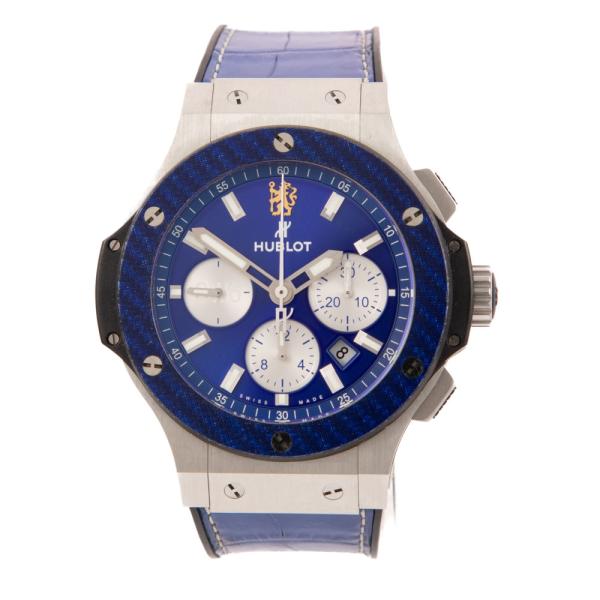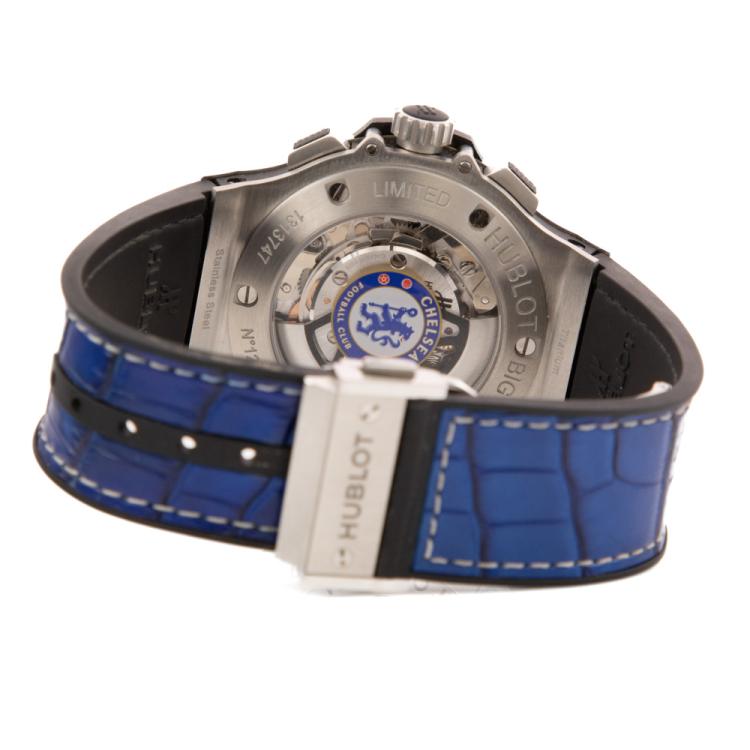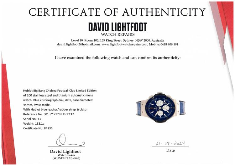 Hublot Big Bang Chelsea Football Club Limited Edition of 200 stainless steel and titanium automatic mens watch. Blue chronograph dial, date, case diameter: 44mm, adjustable max wrist size: 19cm, Swiss made. Ref# 301.SY.7129.LR.CFC17. With Hublot blue leather/rubber strap & clasp. With Certificate of Authenticity, Hublot International Warranty card dated 13/11/2018, Chelsea 2017-2018 Home Football Shirt and Hublot box. 3 month FSA warranty (Pre-owned).