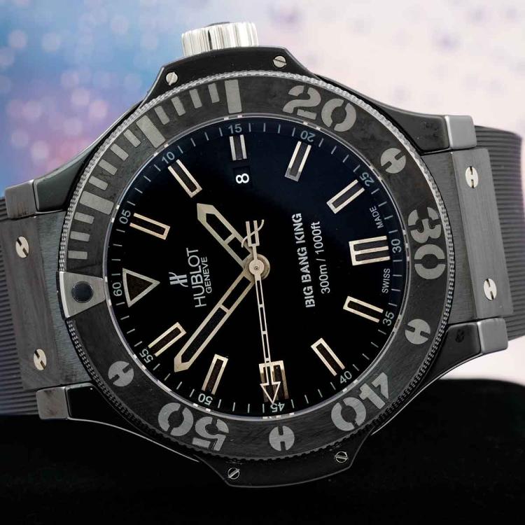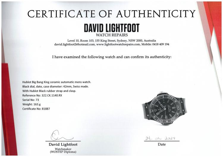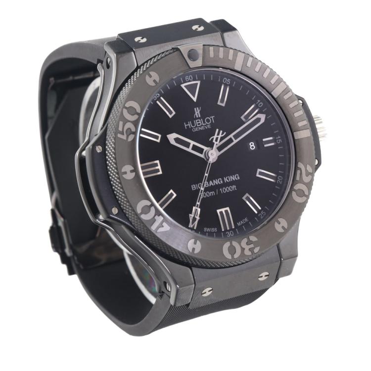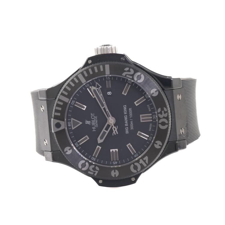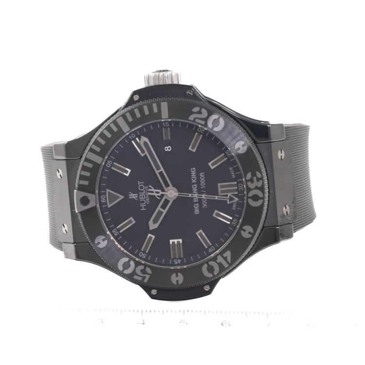 Hublot Big Bang King ceramic automatic mens watch. Black dial, date, case diameter: 42mm, wrist size: 17cm, Swiss made. Ref# 322.CK.1140.RX. With Hublot Black rubber strap and clasp. With Certificate of Authenticity, Hublot international warranty card dated 12/2008 and Hublot box. 3 month FSA warranty. (Pre-owned)