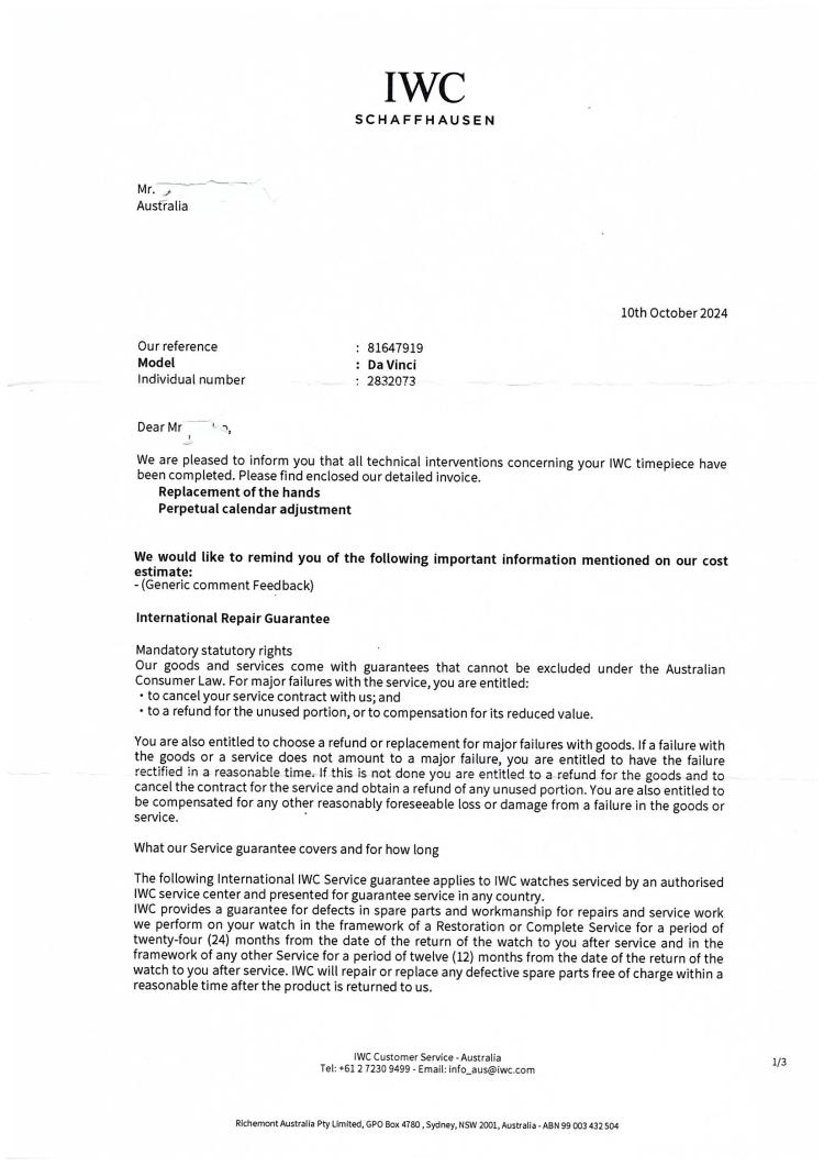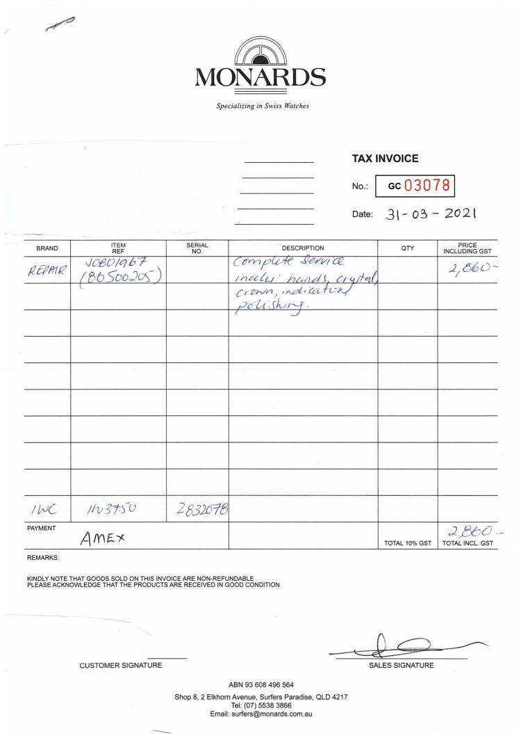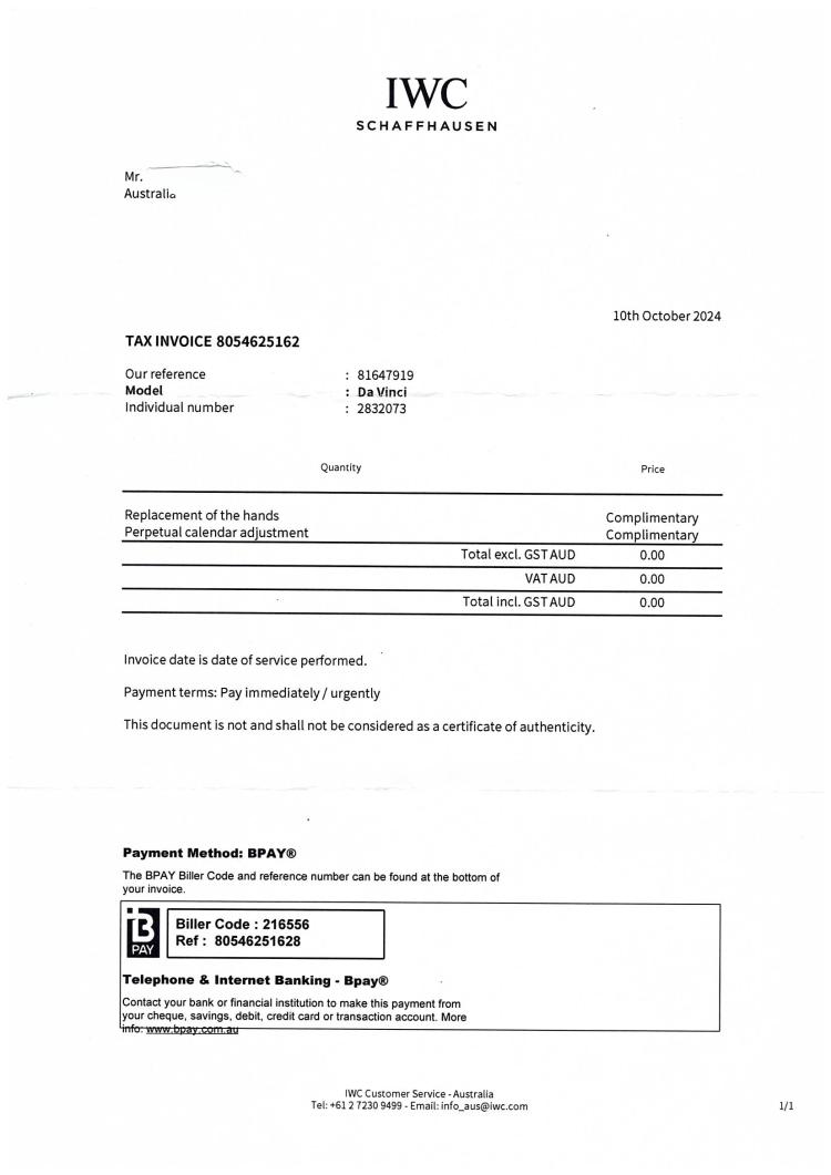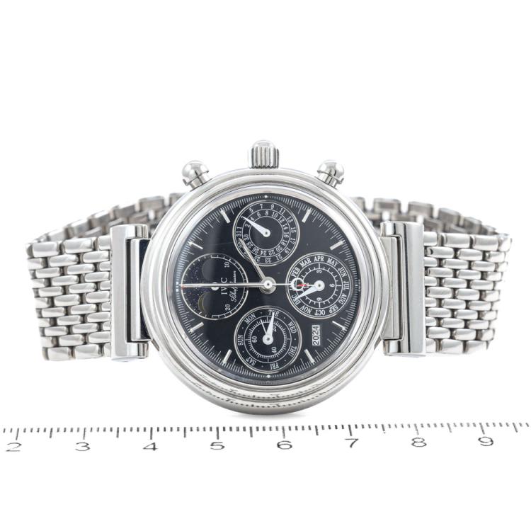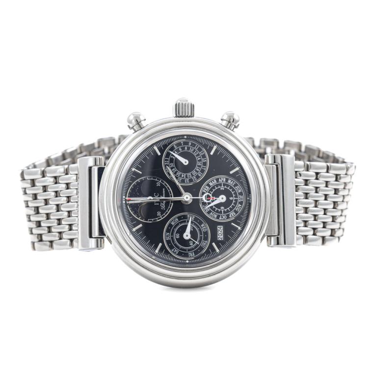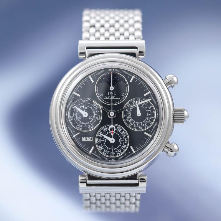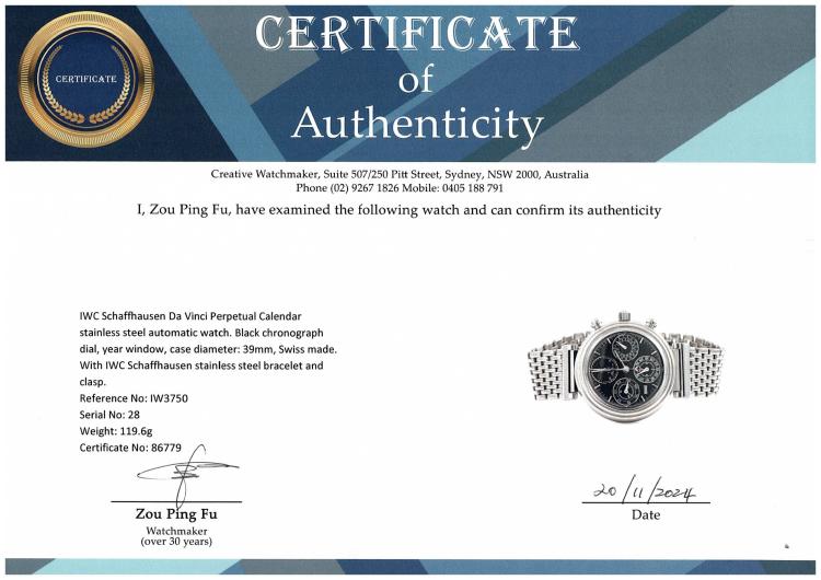 IWC Schaffhausen Da Vinci Perpetual Calendar stainless steel automatic watch. Black chronograph dial, year window, case diameter: 39mm, wrist size: 19cm, Swiss made. Ref #IW3750. With IWC Schaffhausen stainless steel bracelet and clasp. With Certificate of Authenticity, IWC Schaffhausen repair invoice dated 10/10/2024, Monards complete service invoice dated 31/03/2021 & IWC Schaffhausen case. Balance of 12 months IWC Schaffhausen service from the date of service. (Pre-owned)