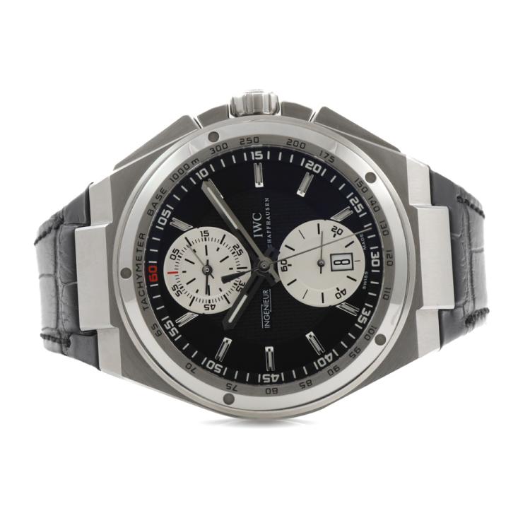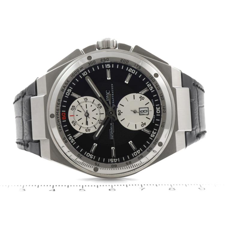 IWC Schaffhausen Ingenieur stainless steel automatic mens watch. Black chronograph dial, date, approximately case diameter: 46mm, strap length: 21.5cm, Swiss made. Ref# 3784. With IWC Schaffhausen black leather strap and buckle. With Certificate of Authenticity. 3 month FSA warranty (Pre-owned)