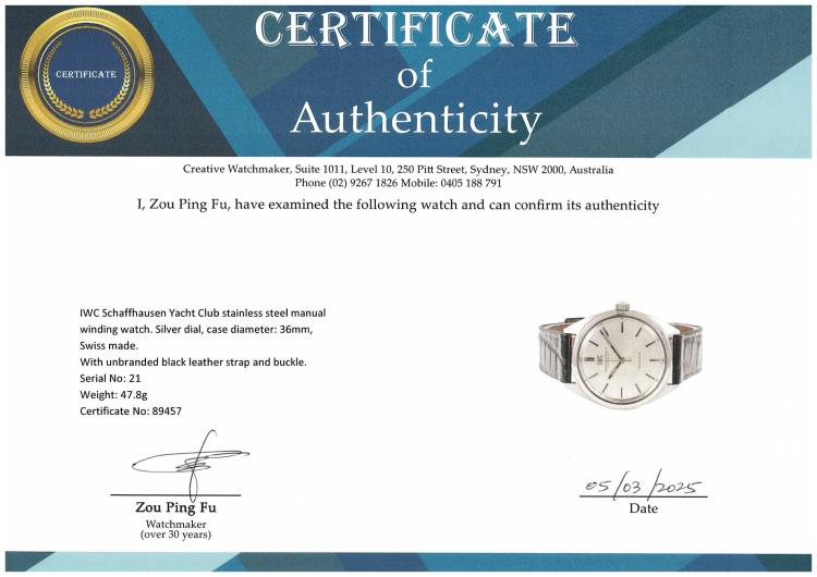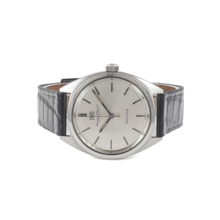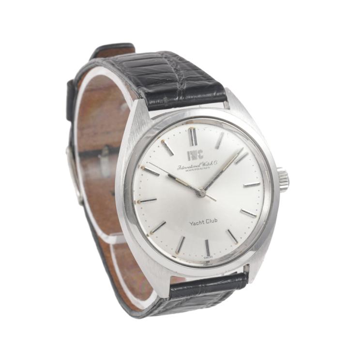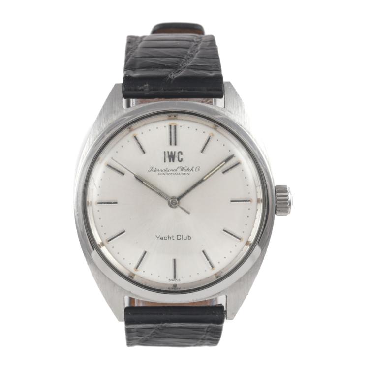 IWC Schaffhausen Vintage Yacht Club stainless steel manual winding mens watch. Silver dial, case diameter: 36mm, strap length: 19.5cm, Swiss made. With unbranded black leather strap and buckle. With certificate of Authenticity. No warranty applies. (Pre-owned)