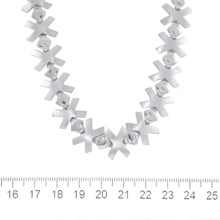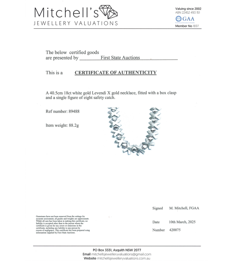 Levendi gold necklace with 30 X links. 18ct white gold. Length: 40.5cm. Width: 14.6mm. Weigh: 88.2g. With Certificate #420075. (Pre-owned)