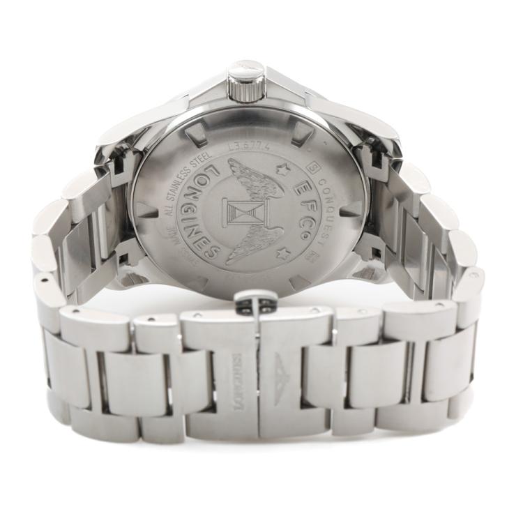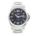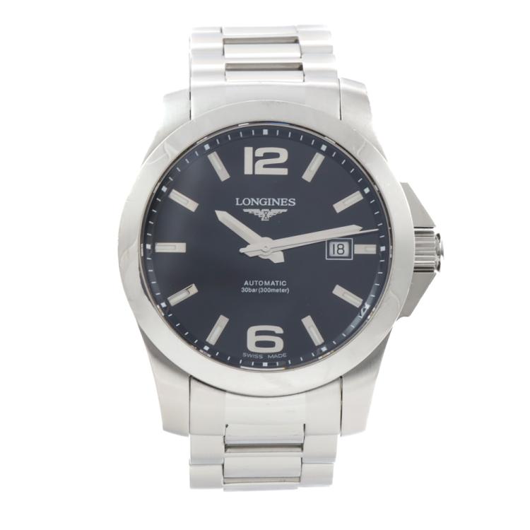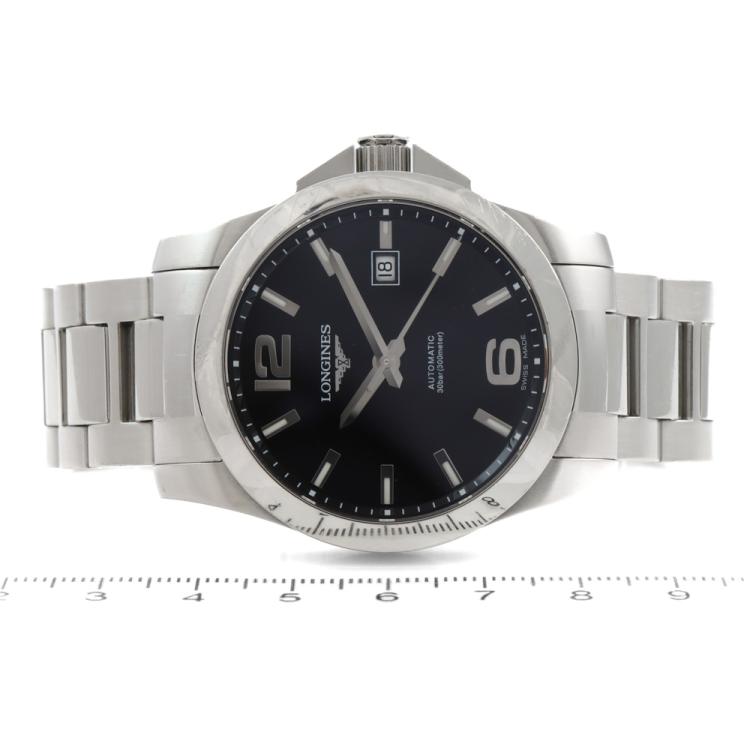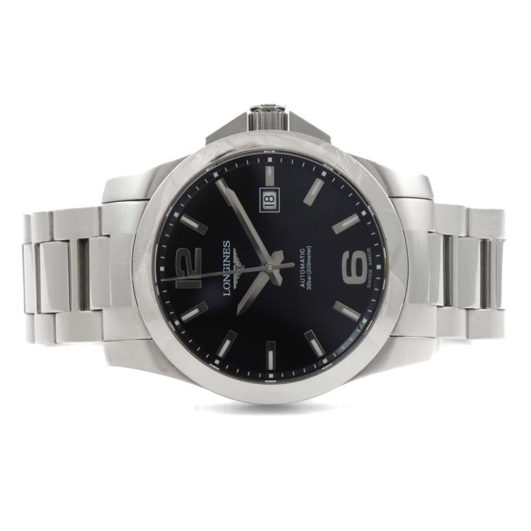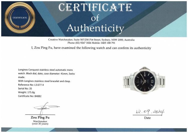 Longines Conquest stainless steel automatic mens watch. Black dial, date, case diameter: 41mm, wrist size: 19cm, Swiss made. Ref# L3.677.4. With Longines stainless steel bracelet and clasp. With Certificate of Authenticity. 3 month FSA Warranty (Pre-owned)