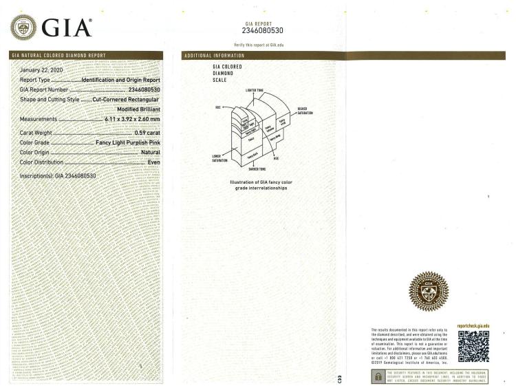 A loose radiant cut natural pink Diamond of 0.59ct (With GSL Report graded as Natural Fancy Light Purplish Pink P2 #AA69083/2 and GIA Report graded as even Natural Fancy Light Purplish Pink #2346080530). (New)