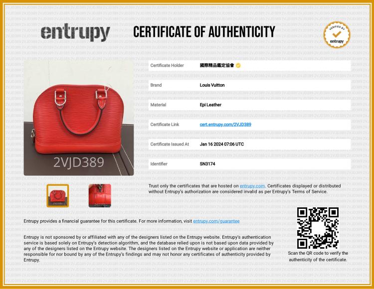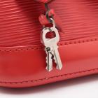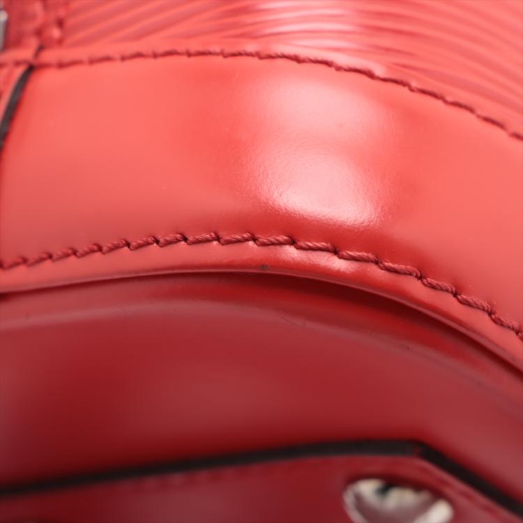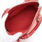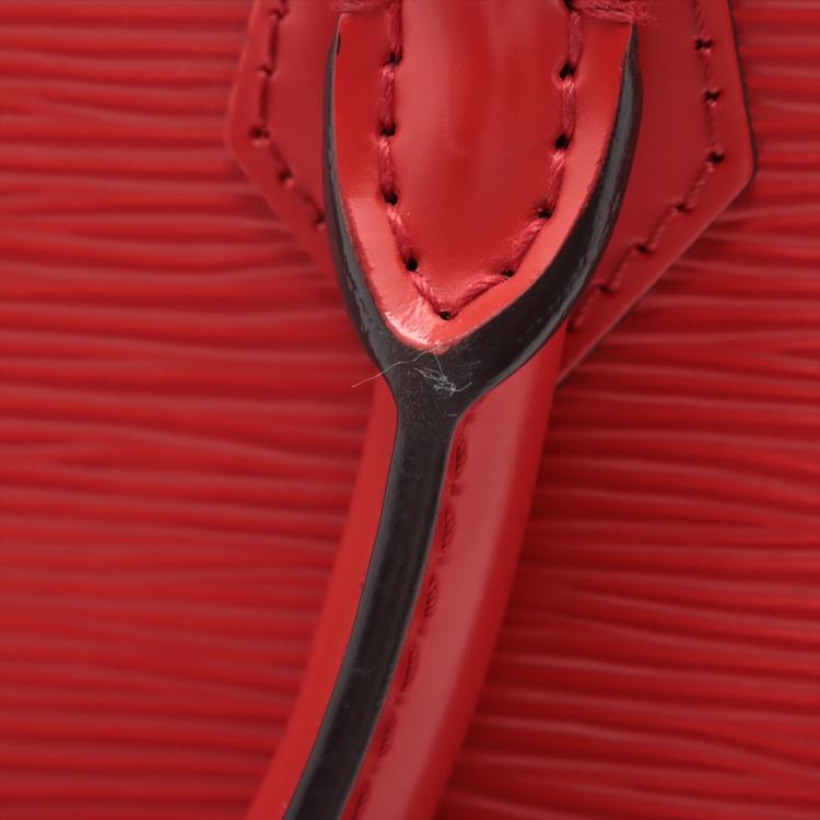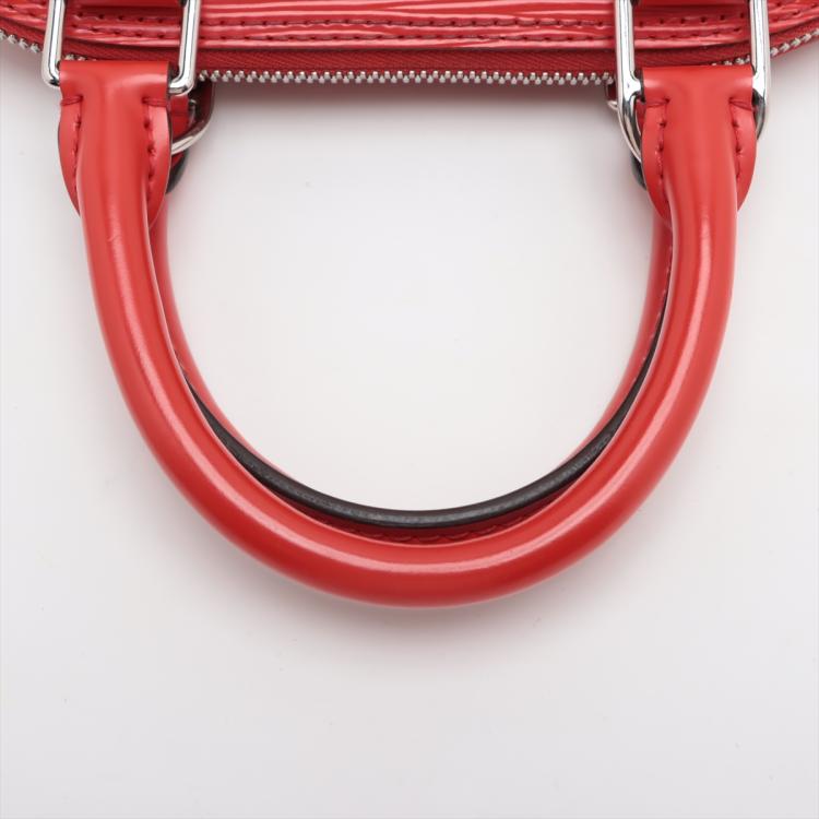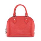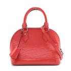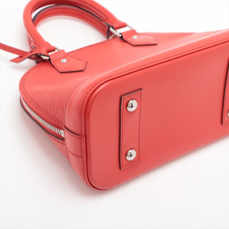 Louis Vuitton Alma BB bag in red Epi leather. Featuring smooth cowhide-leather trim, silver-toned hardware, dual rolled handles and double zip closure. The top opens to a matching colour microfiber lining interior with a patched pocket. Approximate dimensions: 24cm (L) x 16.5cm (H) x 11.5cm (D), 9cm handle drop and 56cm detachable strap drop. Accompanied by LV padlock, keys, crochet. With Entrupy Certificate of Authenticity. (Pre-owned)