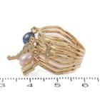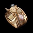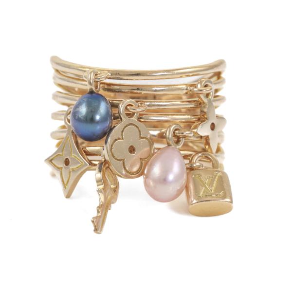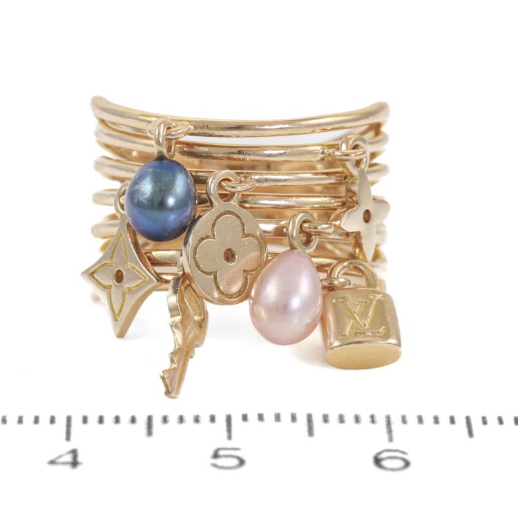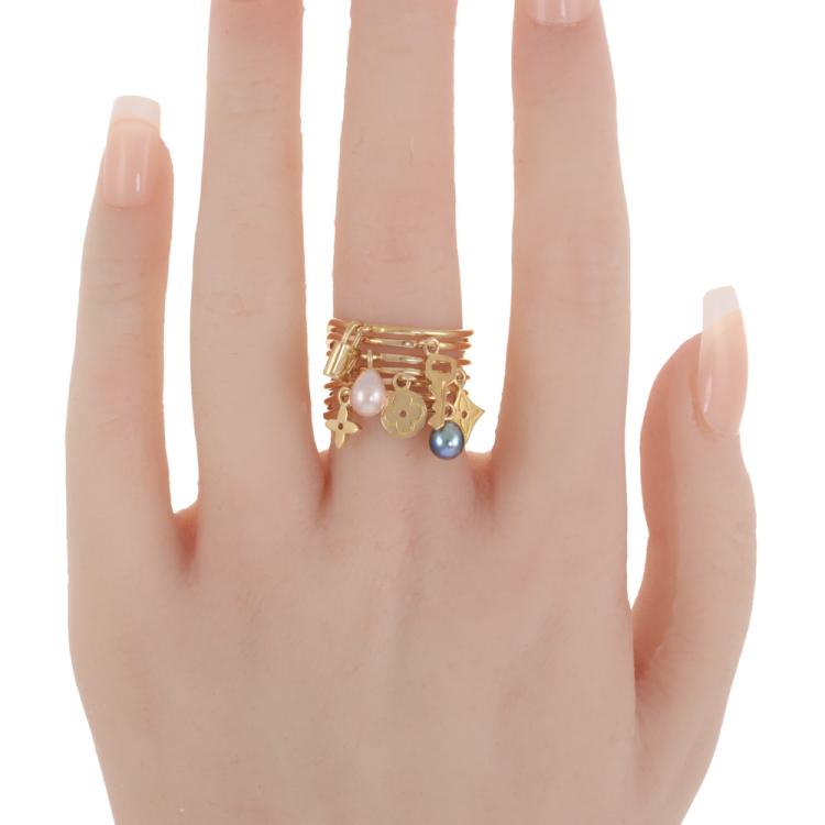 Louis Vuitton Berg Monogram ring with 2 drop shape Cultured Pearls of 4.7mm and 5 Louis Vuitton monogram charms. 18ct yellow gold. Stamped size 52, L1/2 - ring resizing is not recommended. Minimum band width: 6.4mm. Weight: 10.0g. (Pre-owned)