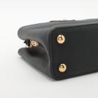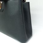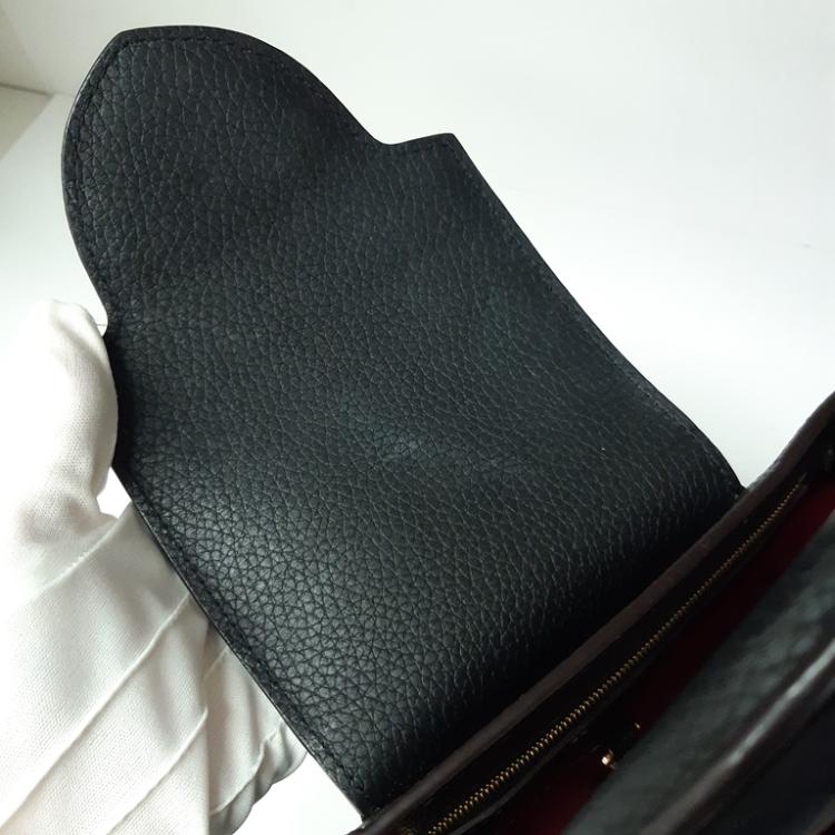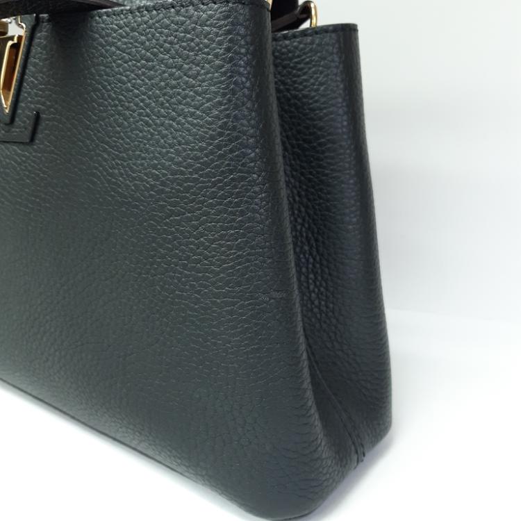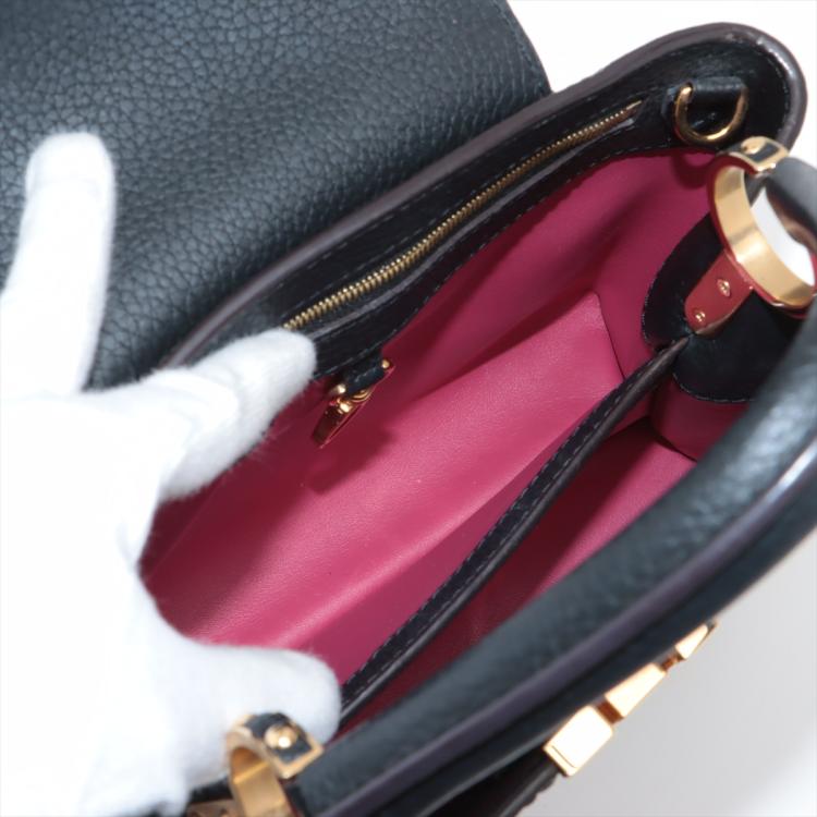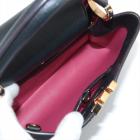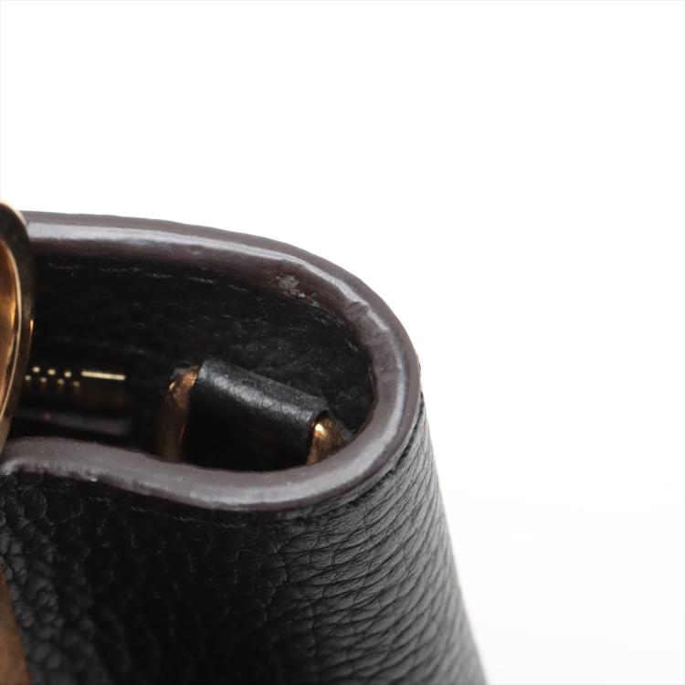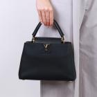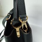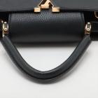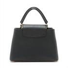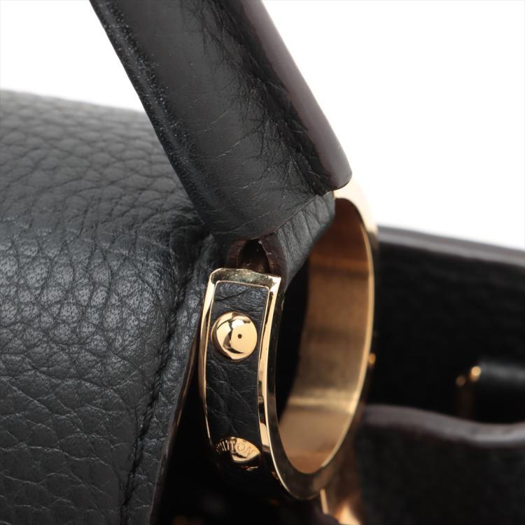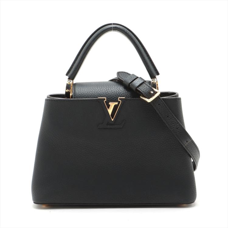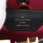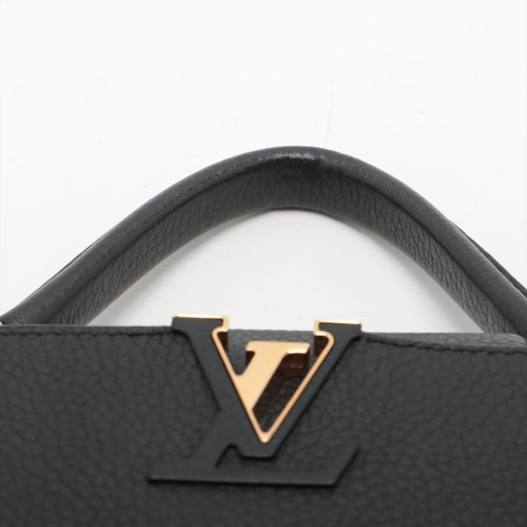 Louis Vuitton Capucines BB in black Taurillon leather. Featuring gold-toned hardware, leather-wrapped LV initials, and single rolled leather handle. The flap and hook closure open to a pink leather interior with two compartments and a zipper pocket. Approximate dimensions: 26.5cm(Base-L) x 17.5cm(H) x 9cm(D), handle drop 9cm, adjustable and detachable strap 58cm. With Entrupy Certificate of Authenticity. (Pre-owned)