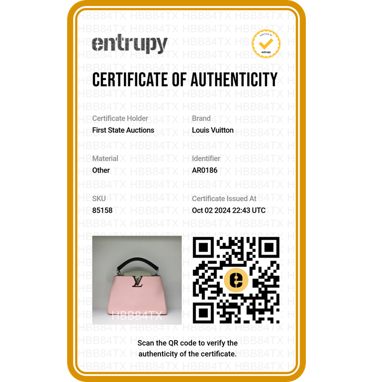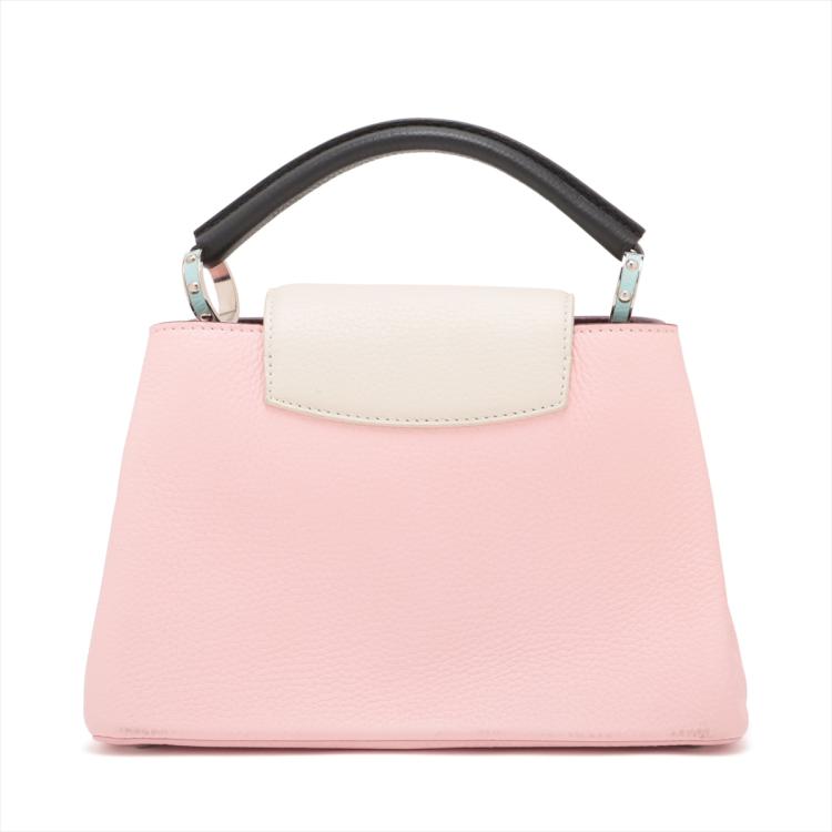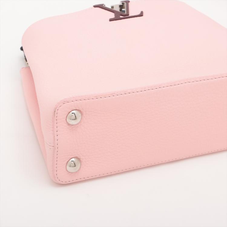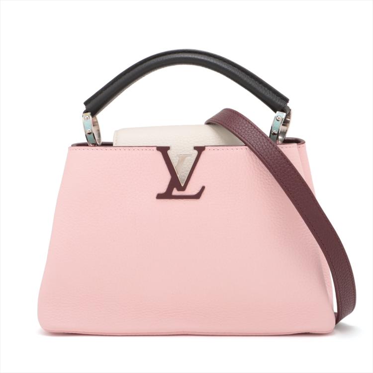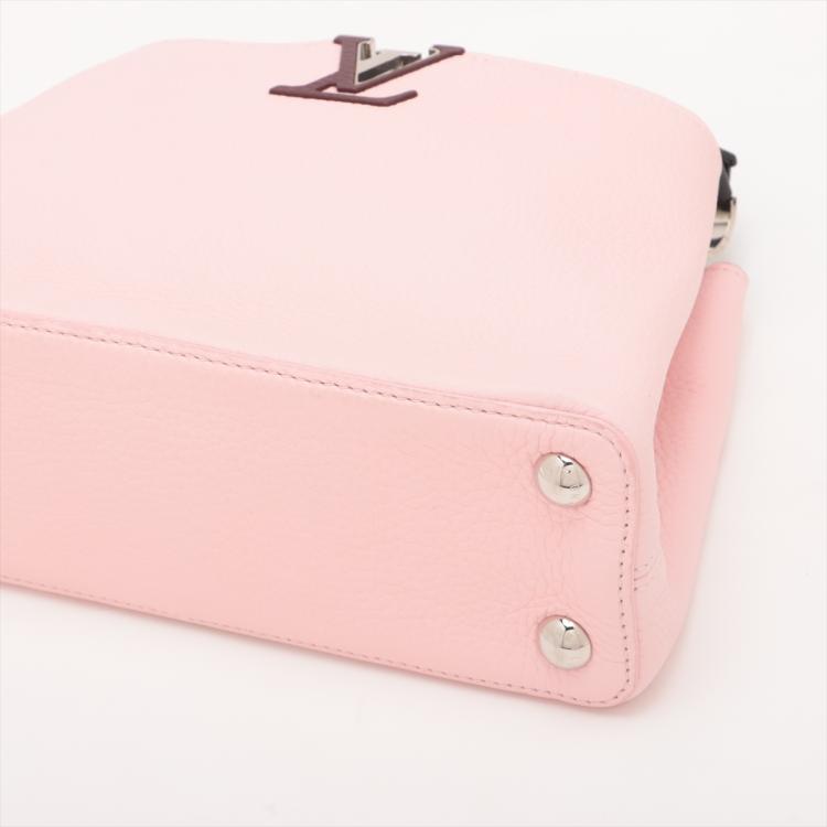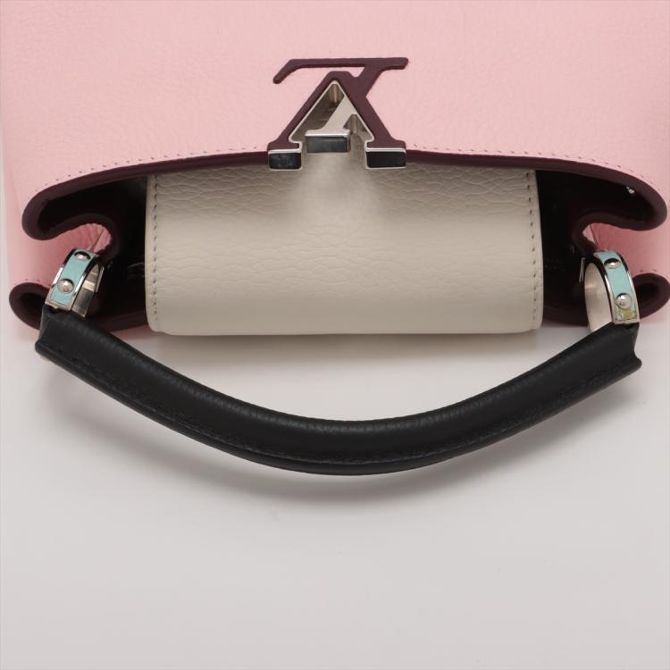Louis Vuitton Capucines BB in light pink and white Taurillon leather. Featuring silver-toned hardware, leather-wrapped LV initials, and single black leather handle. The flap and hook closure open to a burgundy leather interior with two compartments and a zipper pocket. Approximate dimensions: 26cm(L) x 18cm(H) x 9cm(D), handle drop 7cm, adjustable and detachable strap 51cm. With Entrupy Certificate of Authenticity. (Pre-owned)