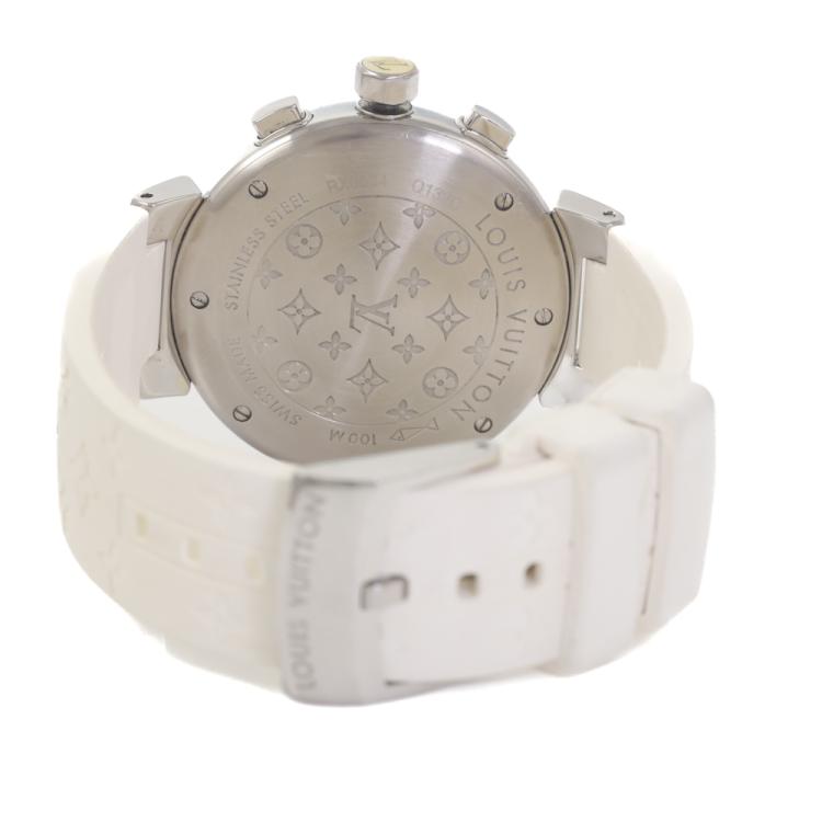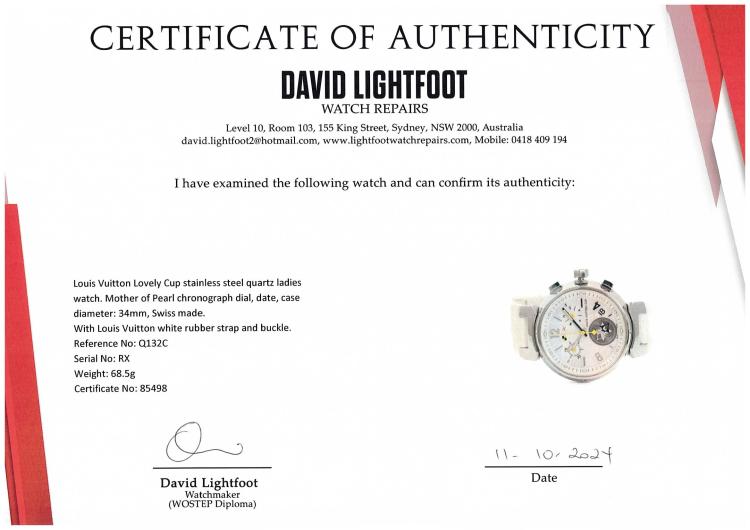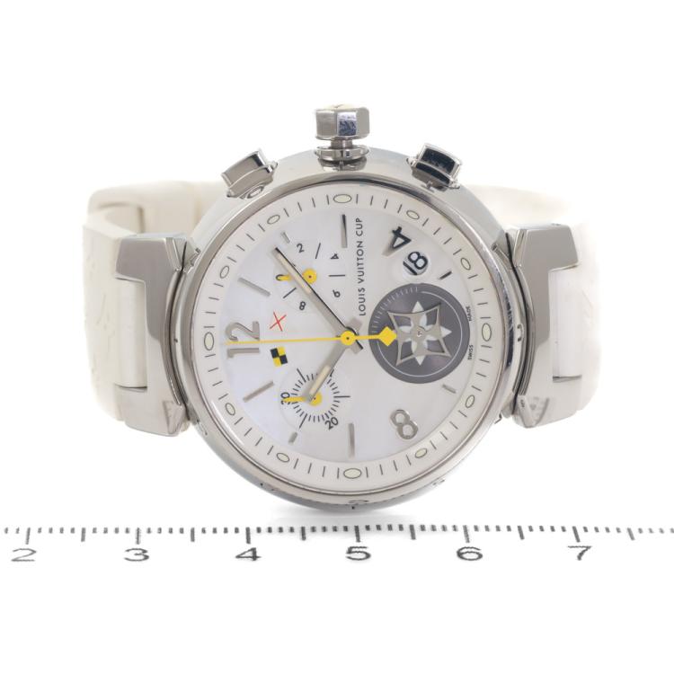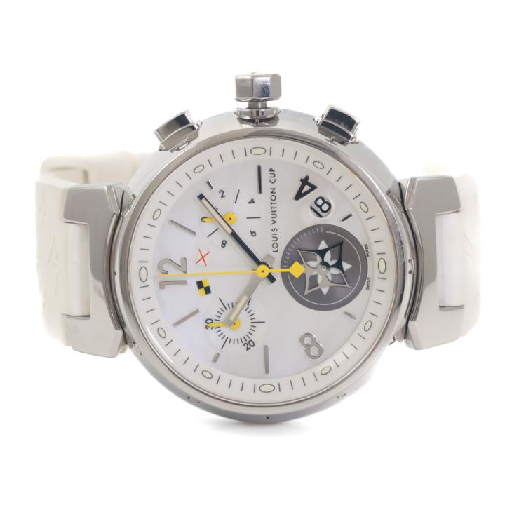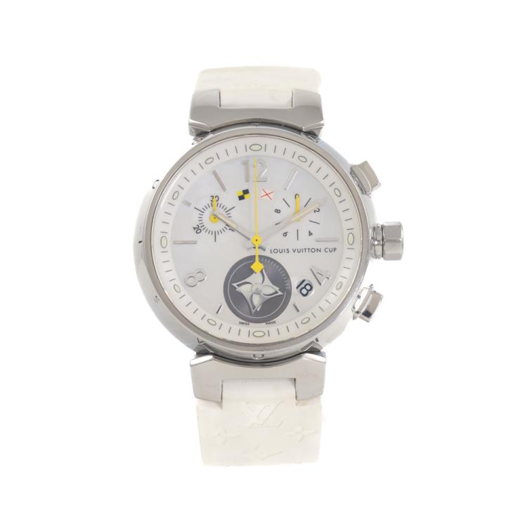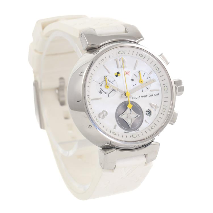 Louis Vuitton Lovely Cup stainless steel quartz ladies watch. Mother of Pearl chronograph dial, date, case diameter: 34mm, strap length including case: 18cm, Swiss made. Ref# Q132C. With Louis Vuitton white rubber strap and buckle. With Certificate of Authenticity. With Louis Vuitton dust bag. 3 month FSA warranty (Pre-owned)