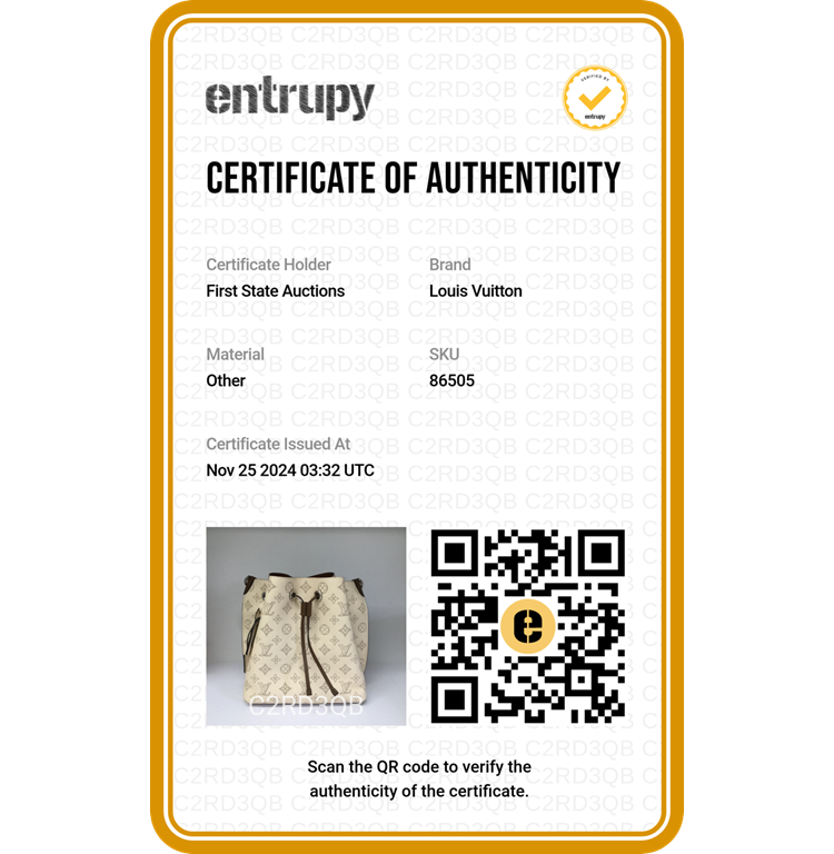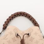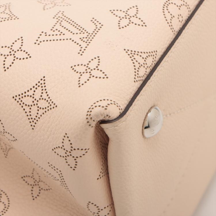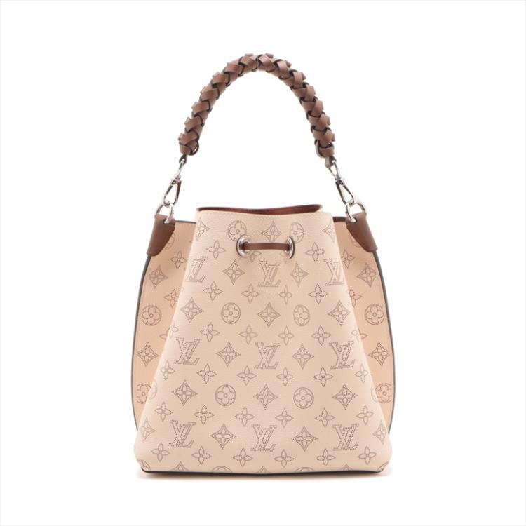 Louis Vuitton Mulia bucket bag in beige mahina calfskin. Featuring Monogram perforated, silver-toned hardware, single braided handle and a pull cinch cord closure. The top opens to a suede interior with a zipped pocket in the middle. Approx dimensions: 24cm(L) x 25cm(H) x 15cm(D), 13.5cm handle drop and 55cm detachable and adjustable strap drop. Accompanied by padlock, keys, crochet, name tag and dustbags. With Entrupy Certificate of Authenticity. (Pre-owned)