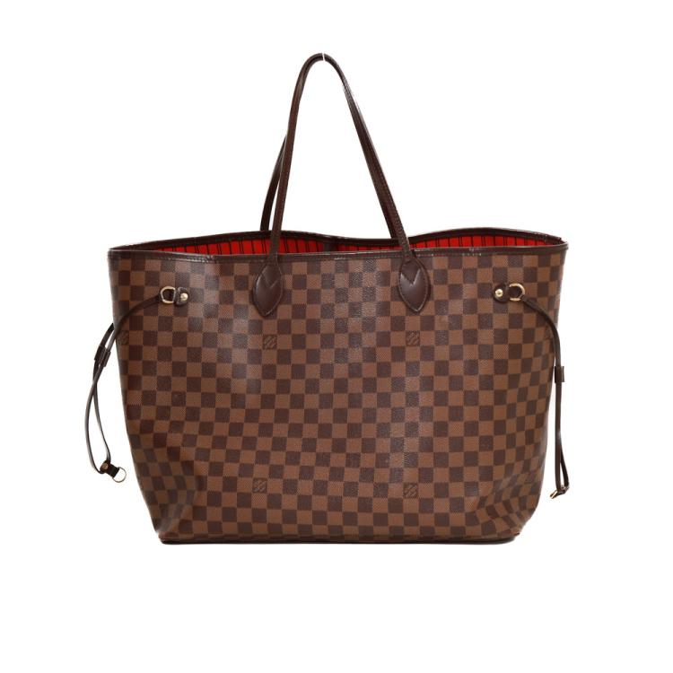 Louis Vuitton Neverfull GM tote in Damier Ebene coated canvas with natural brown cowhide trim. Featuring gold-toned hardware, side laces, and double flat leather handles. The open top with a hook closure reveals to a red striped textile lining with a zipper pocket. Approximate dimensions: 39cm(Base-L) x 32cm(H) x 19cm(D), handle drop 21cm. With Entrupy Certificate of Authenticity. (Pre-owned)