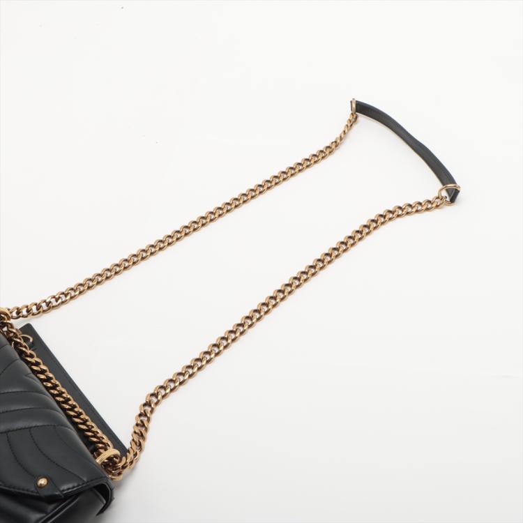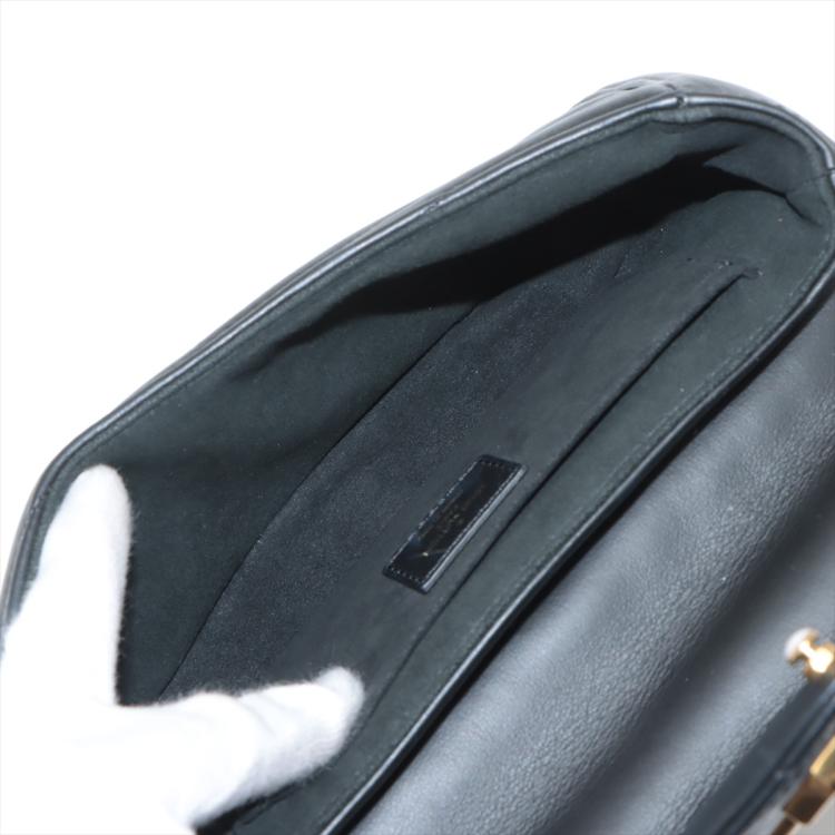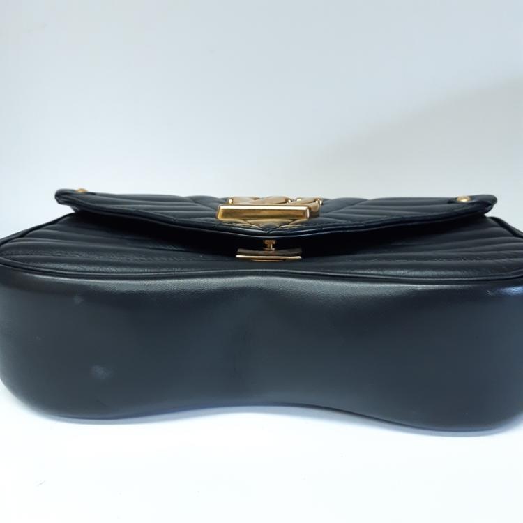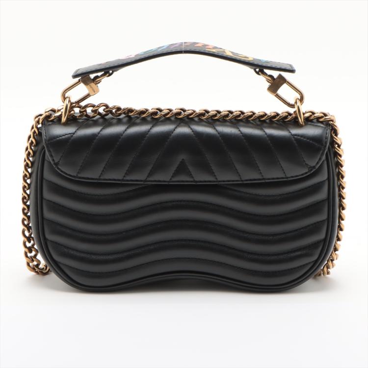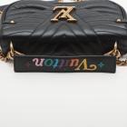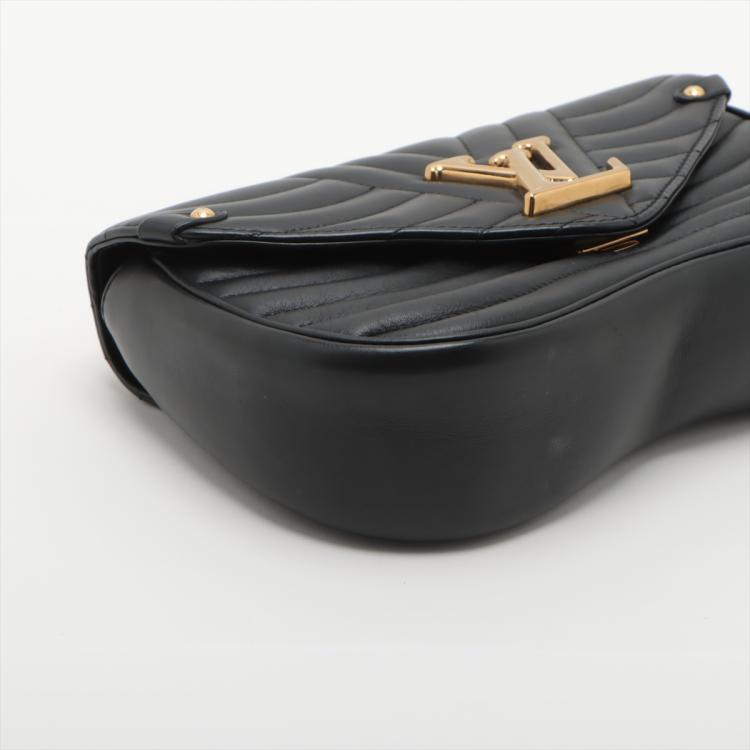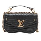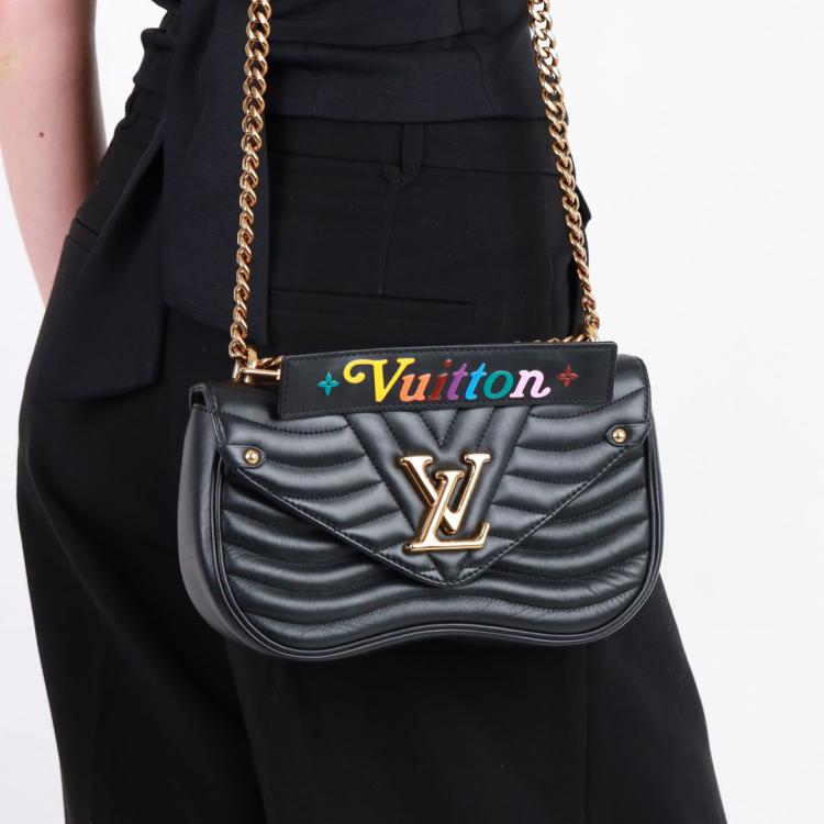 Louis Vuitton New Wave MM crossbody bag in black chevron and wave quilted calfskin leather. Featuring antique gold-tone hardware, removable top handle embossed with multicoloured Vuitton lettering, and sliding chain shoulder strap. The push-lock closure opens to a black microfibre interior with a patch pocket. Approximate dimensions: 25cm(L) x 14cm(H) x 6.5cm(D), handle drop 5cm, strap drop 53cm. With Entrupy Certificate of Authenticity. (Pre-owned)
