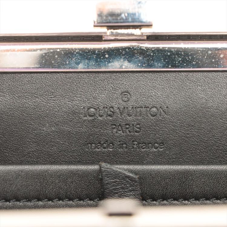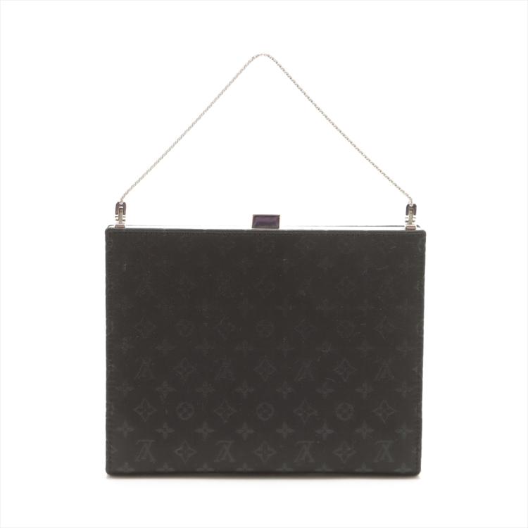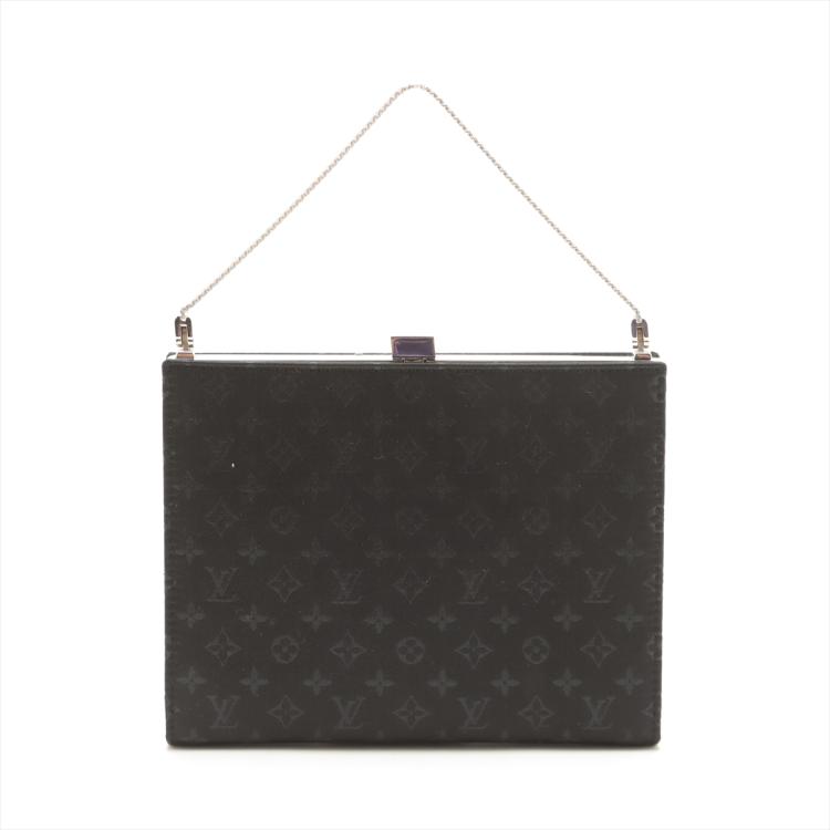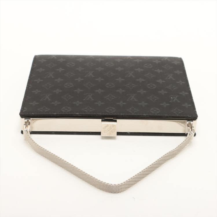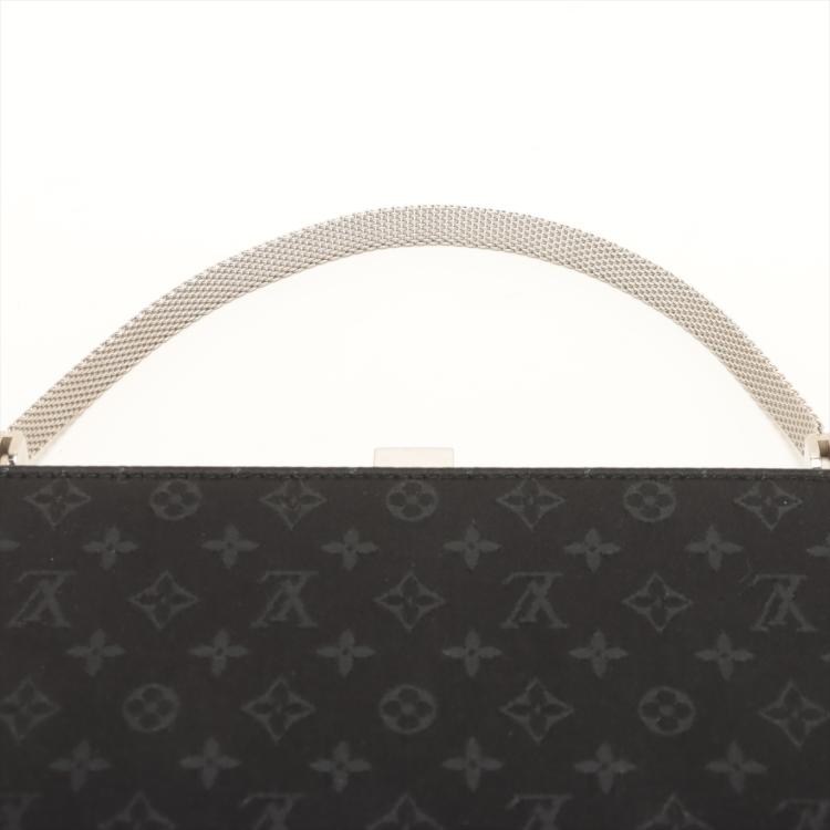 Louis Vuitton Ange MM handbag in black satin with Monogram pattern. Featuring a fine silver mesh metal strap and a shiny silver frame. The push lock closure on top opens to a black leather interior with patch pockets. Approximate dimensions: 17cm(W) x 13.5cm(H) x 2.5cm(D), and 9cm handle height. Accompanied by a metal mirror, LV dustbag and box. With Entrupy Certificate of Authenticity. (Pre-owned)