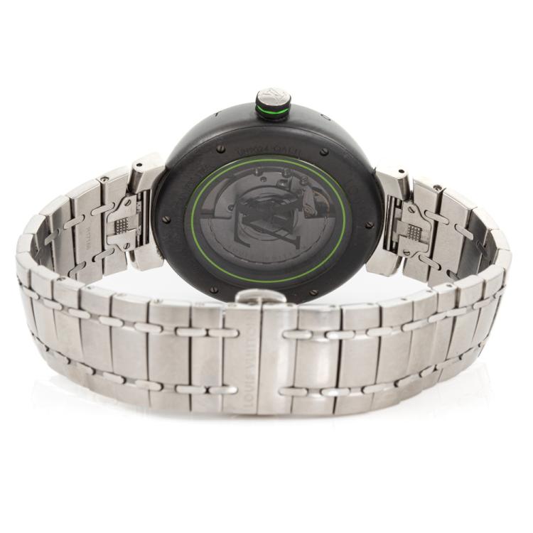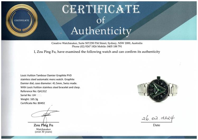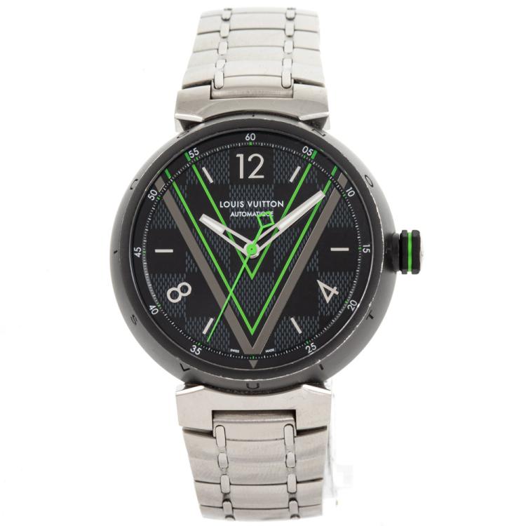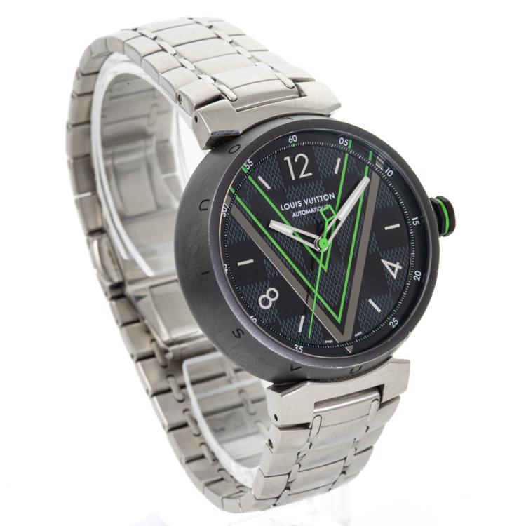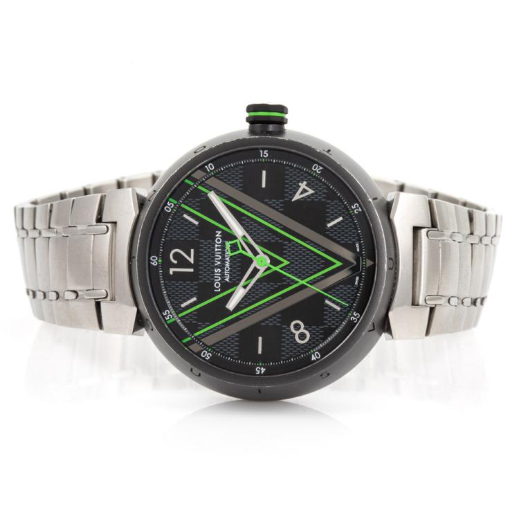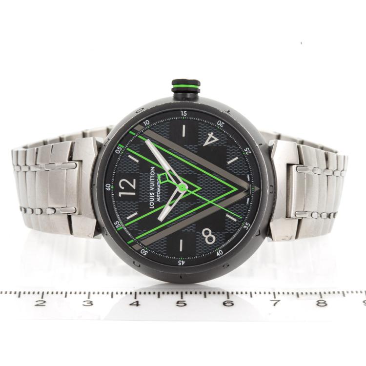 Louis Vuitton Tambour Damier Graphite PVD stainless steel automatic mens watch. Graphite Damier dial, case diameter: 41.5mm, wrist size: 20.5cm, Swiss made. Ref# QA131Z. With Louis Vuitton stainless steel bracelet and clasp. With Certificate of Authenticity and 2 Louis Vuitton boxes. 3 month FSA Warranty. (Pre-owned)