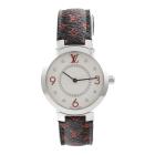Louis Vuitton Tambour stainless steel quartz ladies watch. Silver dial, Diamond indicators, case diameter: 28mm, strap length: 17.5cm, Swiss made. Ref# Q12MG. With Louis Vuitton black/red monogram leather strap and buckle. With Certificate of Authenticity. 3 month FSA warranty. (Pre-owned)