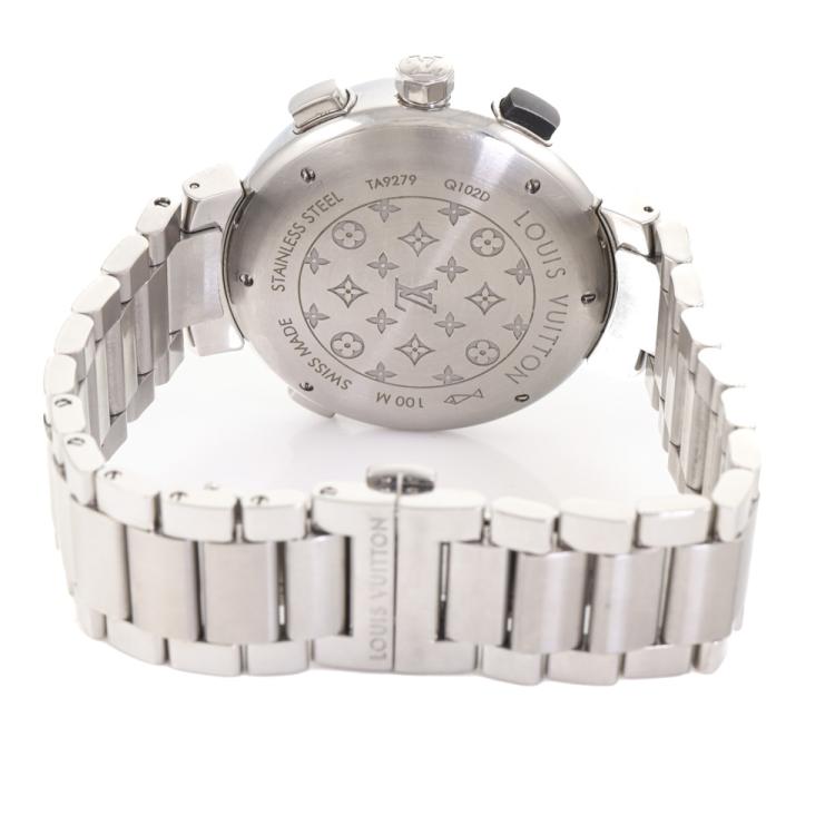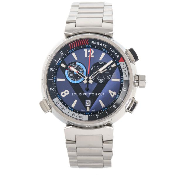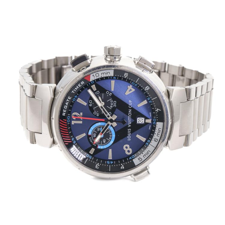 Louis Vuitton Tambour Regatta stainless steel quartz mens watch. Blue chronograph dial, date, case diameter: 44mm, wrist size: 21cm, Swiss made. Ref# Q102D. With Louis Vuitton stainless steel bracelet and clasp. With Certificate of Authenticity and Louis Vuitton box. No warranty applies. WATCH IS NOT FUNCTIONING to manufacturer’s specifications and requires Louis Vuitton servicing. (Pre-owned)