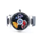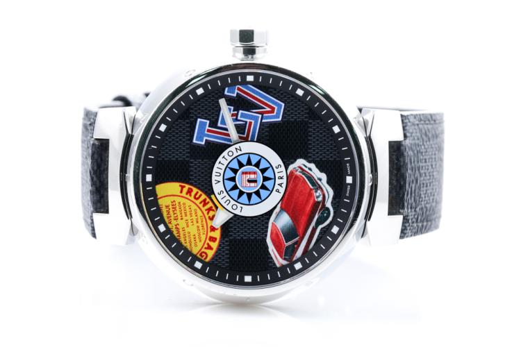 Louis Vuitton Tambour World Tour stainless steel quartz men's watch. Black dial, case diameter: 41mm, Strap length: 20.5cm Swiss made. Ref# QA063. With Louis Vuitton Black leather strap and buckle. With Certificate of Authenticity and Louis Vuitton box. 3 month FSA warranty (Pre-owned)