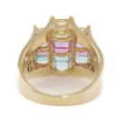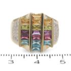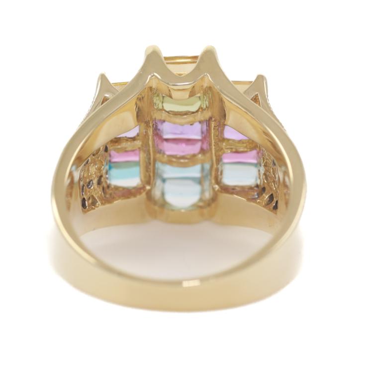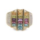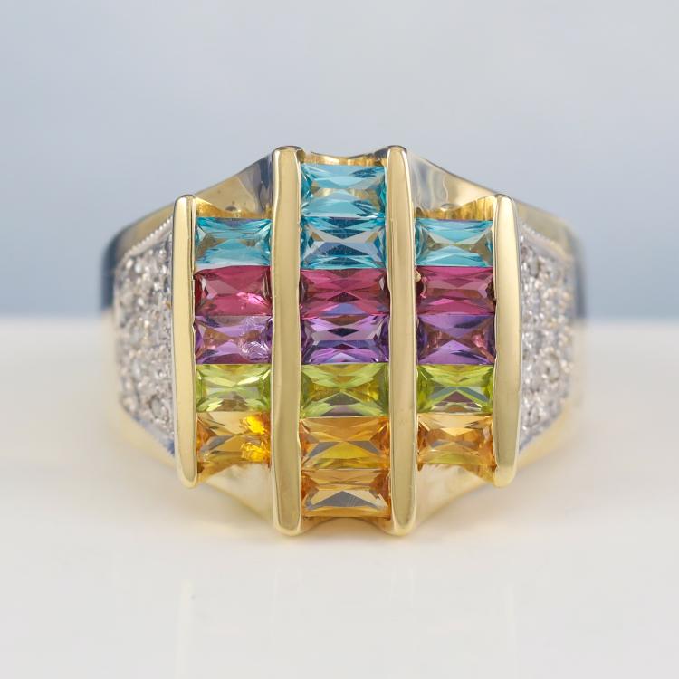 Mixed Gemstone and Diamond ring with rectangular cut Natural Gemstones totalling approximately 1.25ct (including Topaz, Amethyst, Citrine, Peridot & Garnet) and round Natural Diamonds totalling approximately 0.25ct. 14ct yellow and white gold. Ring size M1/2 - ring resizing is not recommended. Band width: 3.1mm-7.5mm. Weight 9.4g. (Pre-owned)