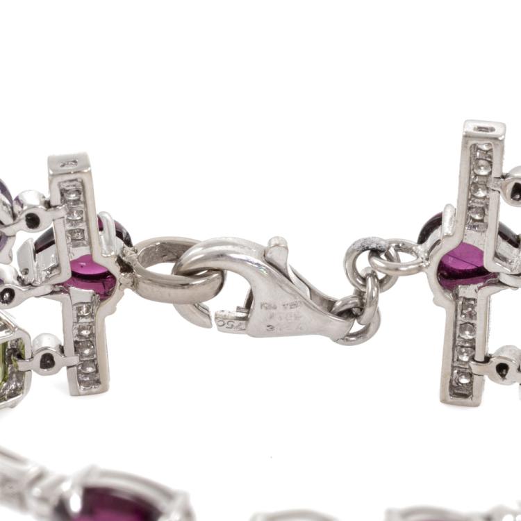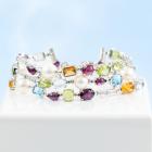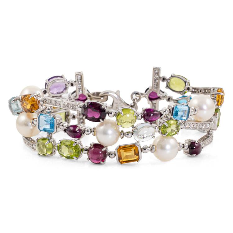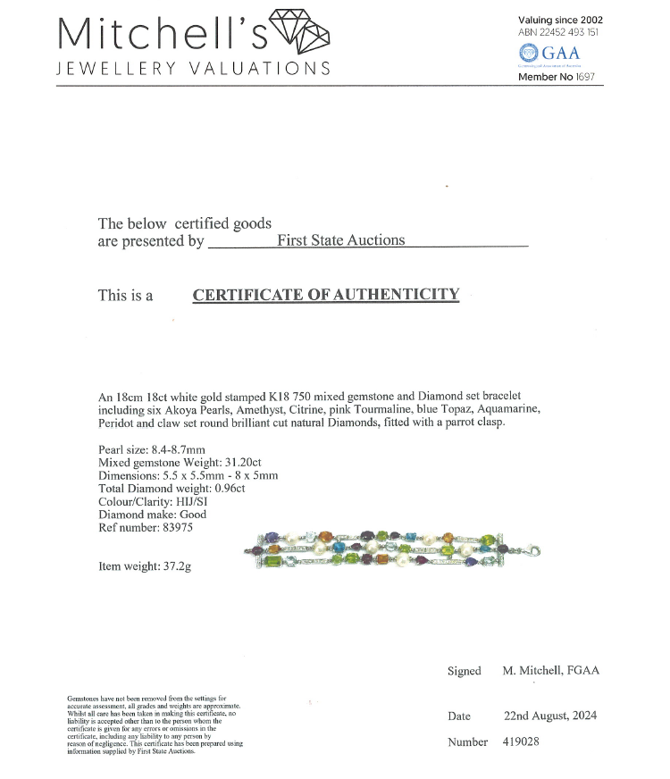 Mixed Gemstone, Pearl and Diamond bracelet with multi shape Amethyst, Citrine, Tourmaline, Topaz, Aquamarine and Peridot totalling 31.20ct and 6 Akoya Pearls of 8.4mm - 8.7mm and round Natural Diamond totalling 0.96ct (Estimated grading: H-J SI). 18ct white gold. Length: 18cm. Weight: 37.2g. With Certificate #419028. (Pre-owned)