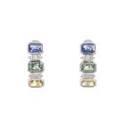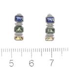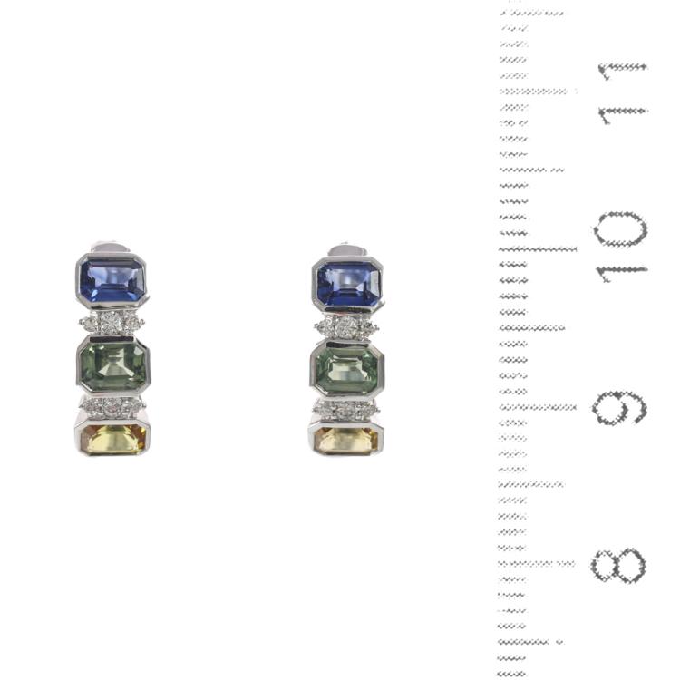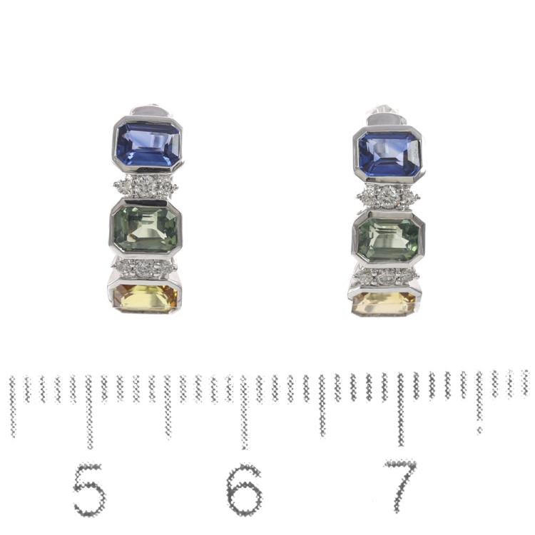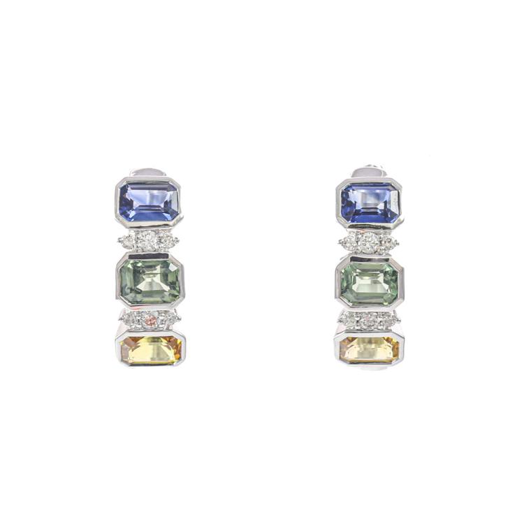 Multi colour Sapphire & Diamond earrings with emerald cut Natural Blue Sapphires totalling 0.65ct, Natural Green Sapphires totalling 0.49ct, Natural Yellow Sapphires totalling 0.61ct & round Natural Diamonds totalling 0.09ct. 18ct white gold. Weight: 2.9g (New)