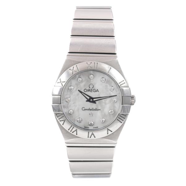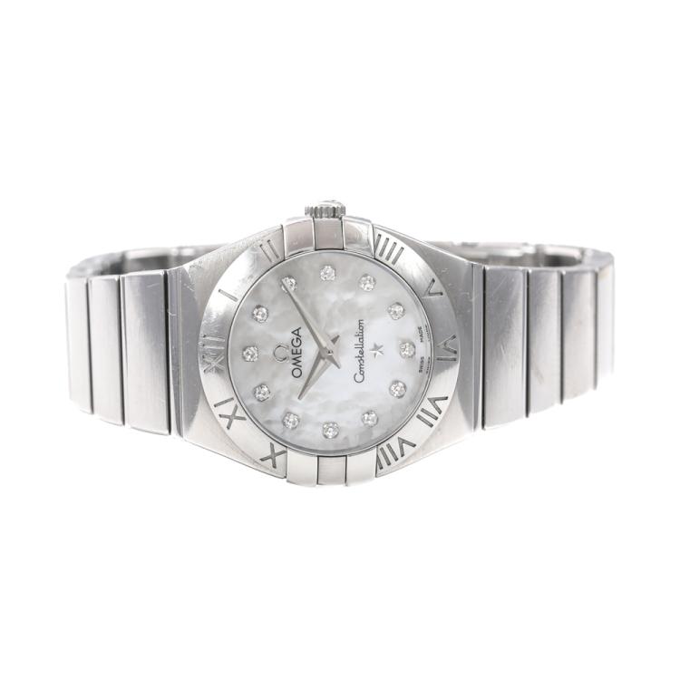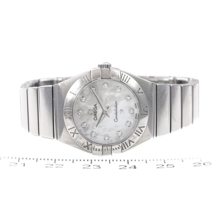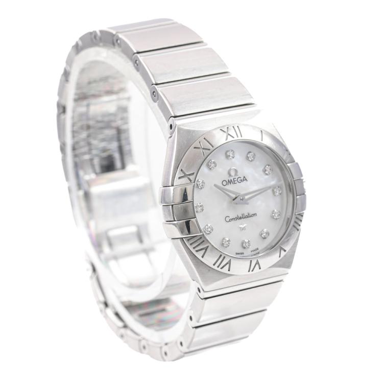 Omega Constellation stainless steel quartz ladies watch. Mother of pearl dial, Diamond indicators, case diameter: 24mm, wrist size: 14cm, Swiss made. Ref# 123.10.24.60.55.001. With Omega stainless steel bracelet and clasp. With Certificate of Authenticity. 3 month FSA warranty (Pre-owned)