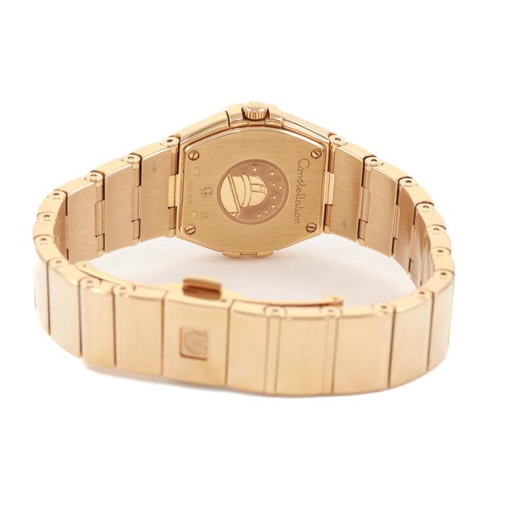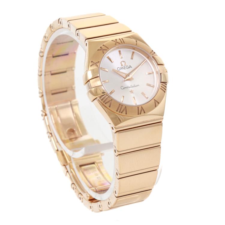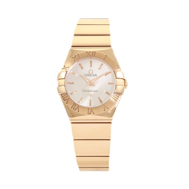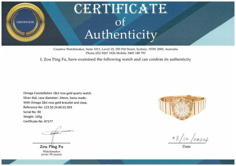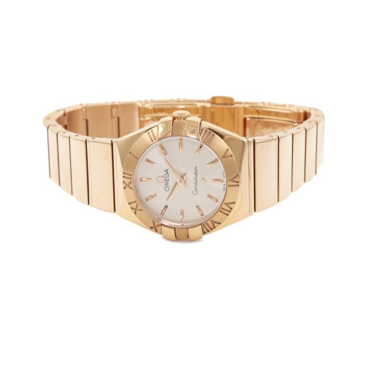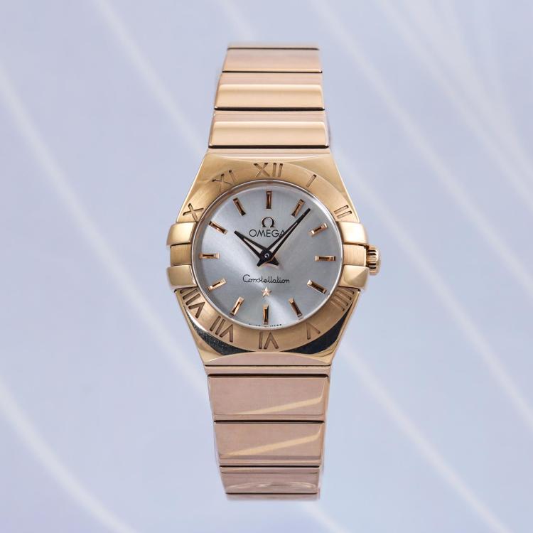 Omega Constellation 18ct rose gold quartz ladies watch. Silver dial, case diameter: 24mm, wrist size: 16cm, Swiss made. Ref# 123.50.24.60.02.003. With Omega 18ct rose gold bracelet and clasp. With Certificate of Authenticity, Omega International Warranty card dated 28/09/2022, Omega Pictograms card and Omega box. Balance of 5 year Omega manufacturer warranty applies. (Pre-owned)