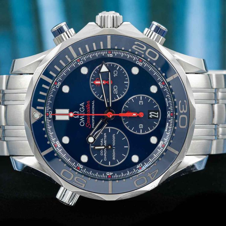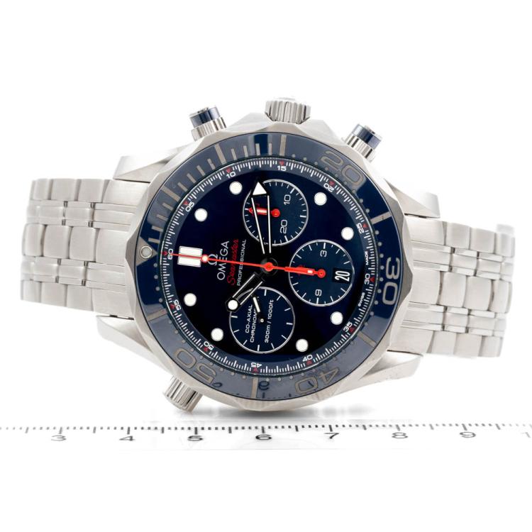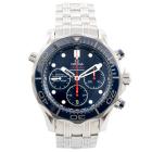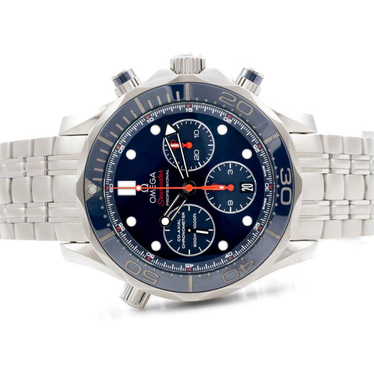 Omega Seamaster Professional stainless steel automatic mens watch. Blue chronograph dial, date, case diameter: 44mm, wrist size: 19.5cm, Swiss made. Ref# 21230445003001. With Omega stainless steel bracelet and clasp. With Certificate of Authenticity, Omega International Warranty card dated 09/07/2019, Omega Pictograms and Omega box. Balance of 5 year Omega manufacturer warranty applies. (Pre-owned)