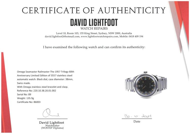 Omega Seamaster Railmaster The 1957 Trilogy 60th Anniversary Limited Edition of 3557 stainless steel automatic watch. Black dial, case diameter: 38mm, wrist size: 16.5cm, Swiss made. Ref #220.10.38.20.01.002. With Omega stainless steel bracelet and clasp. With Certificate of Authenticity and Omega box. 3 month FSA warranty (Pre-owned)