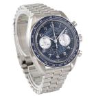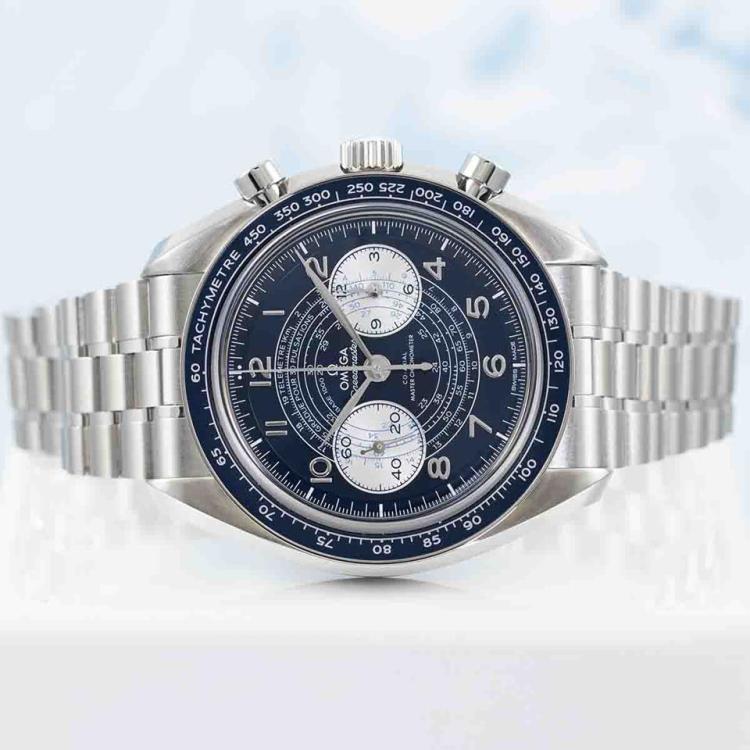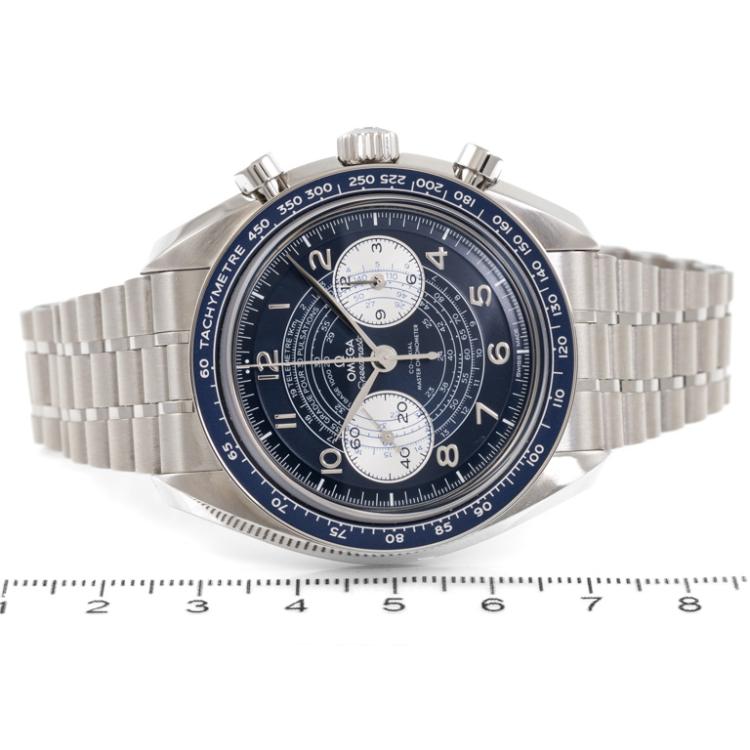 Omega Speedmaster Chronoscope stainless steel manual winding mens watch. Blue chronograph dial, case diameter: 43mm, wrist size: 20cm, Swiss made. Ref# 329.30.43.51.03.001. With Omega stainless steel bracelet and clasp. With Unstamped Omega International Warranty card, Omega Pictograms card and Omega Master chronometer card. 3 month FSA warranty (As new, Note: minor scuff on case and bracelet due to being display stock)