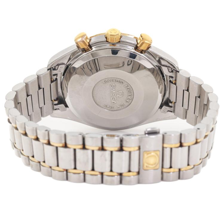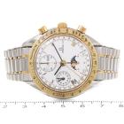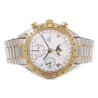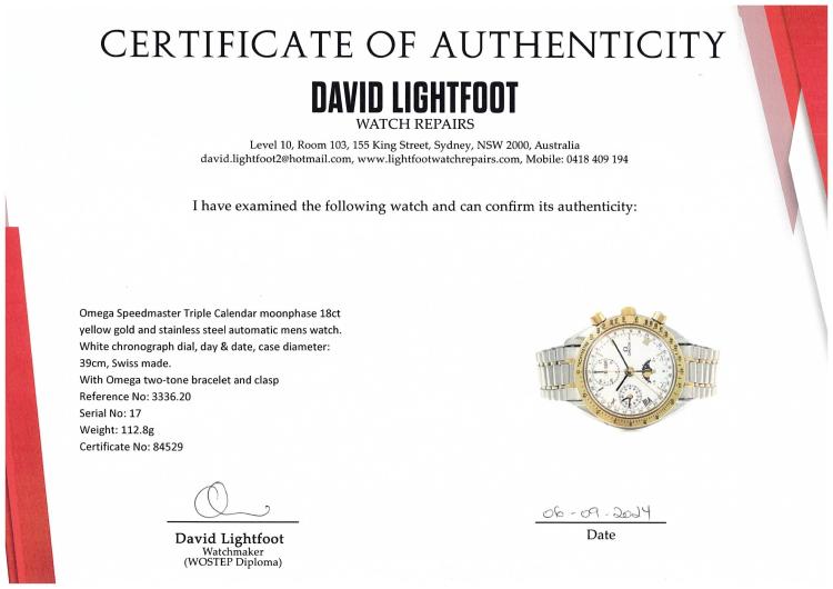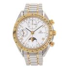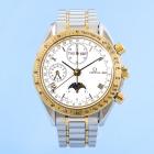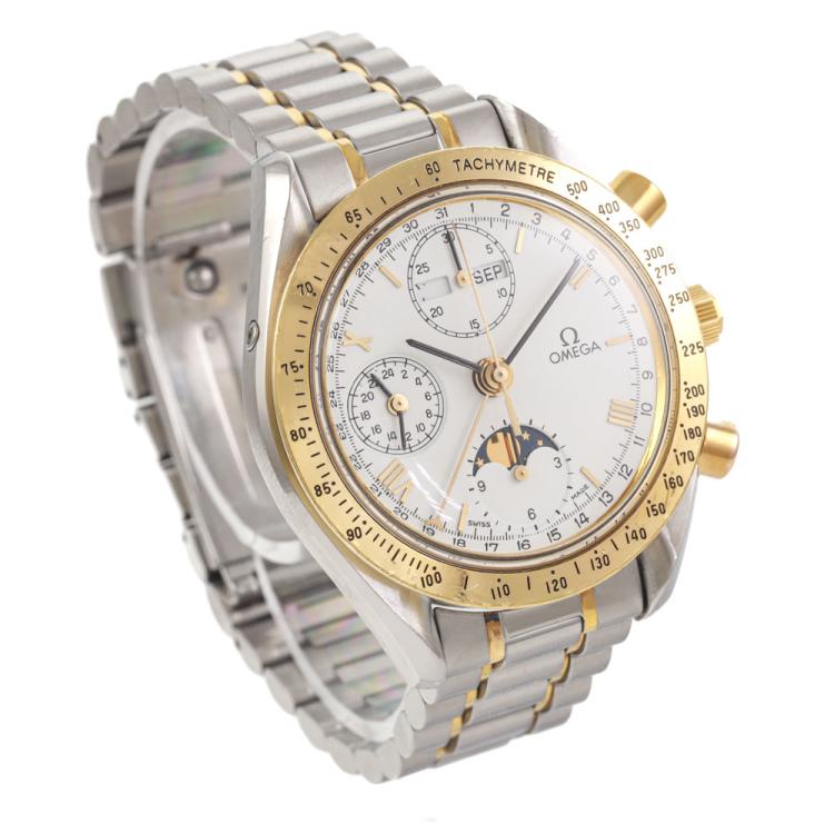 Omega Speedmaster Triple Calendar moonphase 18ct yellow gold and stainless steel automatic mens watch. White chronograph dial, day & date, case diameter: 39cm, wrist size: 17cm, Swiss made. Ref# 3336.20. With Omega two-tone bracelet and clasp. With Certificate of Authenticity. 3 month FSA warranty. (Pre-owned)