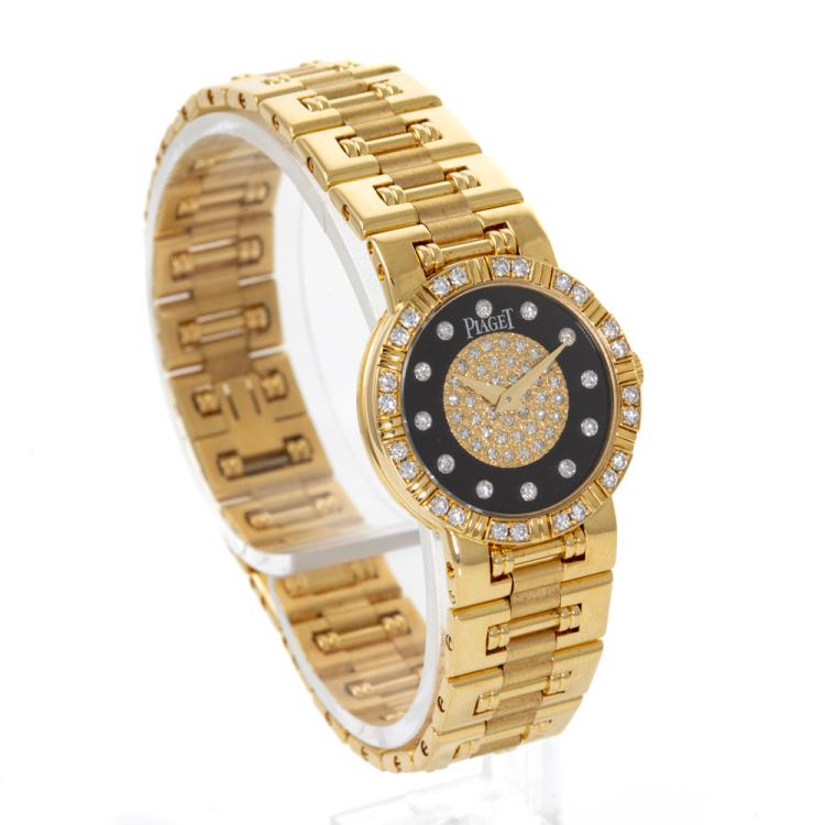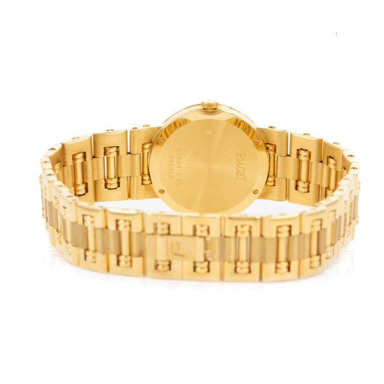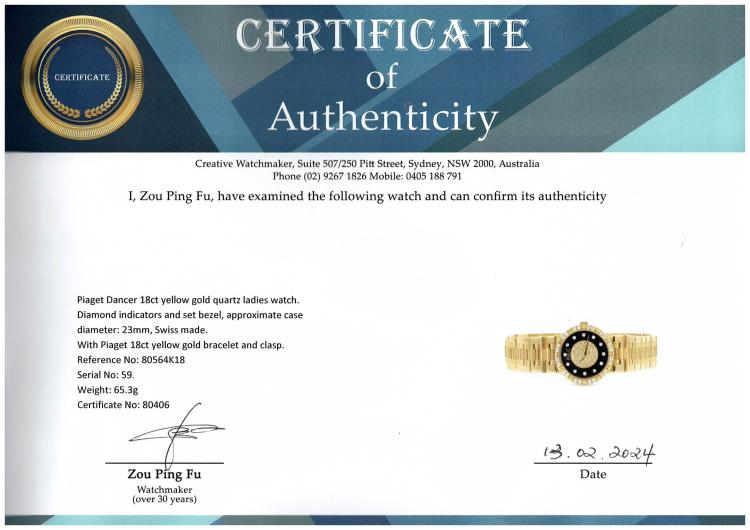 Piaget Dancer 18ct yellow gold quartz ladies watch. Diamond indicators and set bezel, approximate case diameter: 23mm, strap length: 17cm, Swiss made. Ref# 80564K18. With Piaget 18ct yellow gold bracelet and clasp. With Certificate of Authenticity. 3 month FSA warranty (Pre-owned)