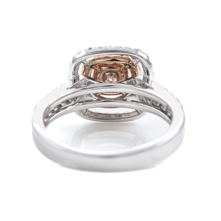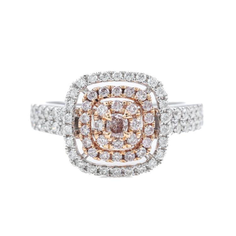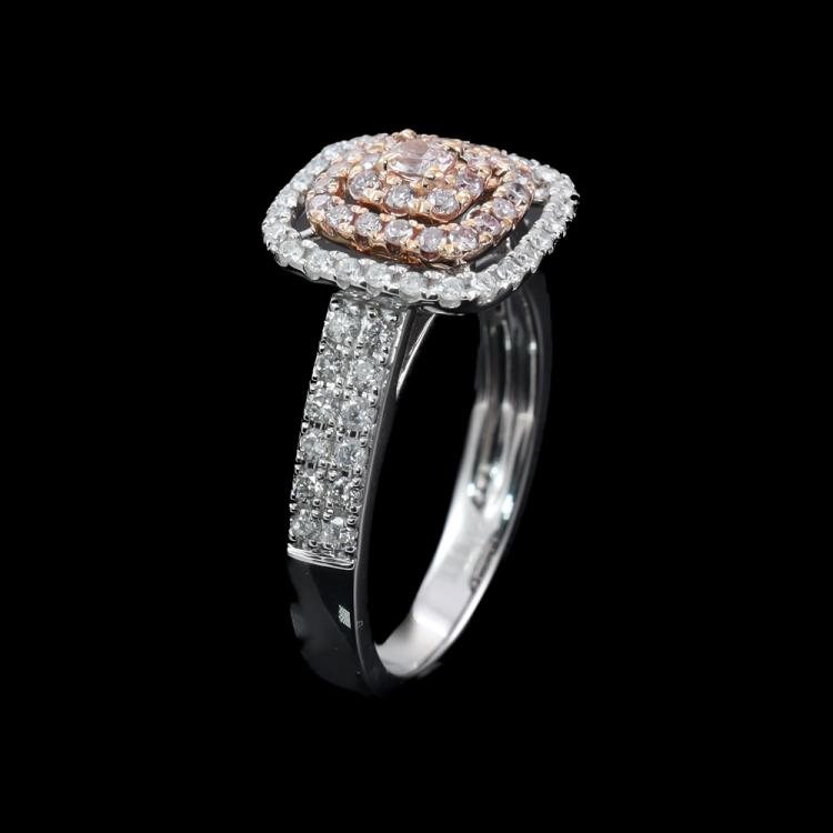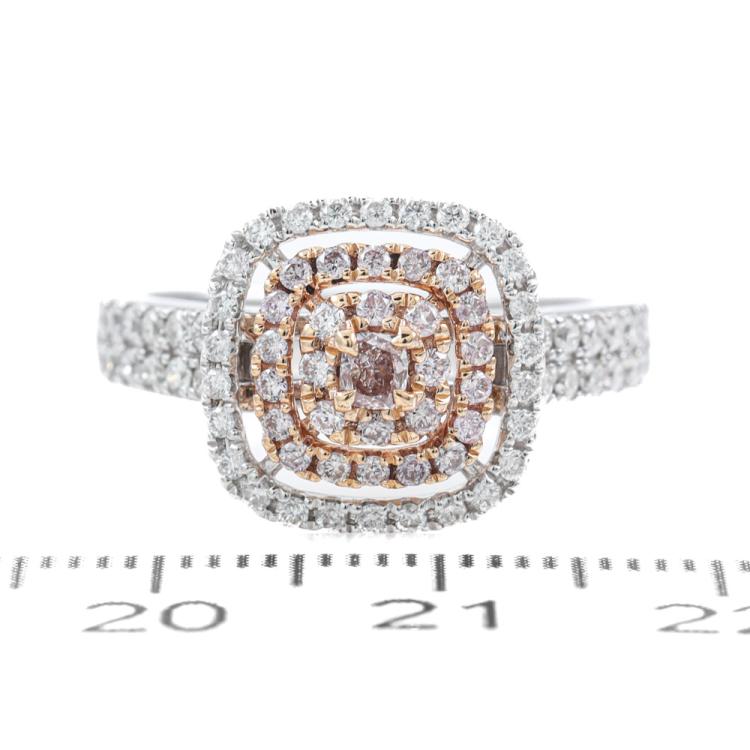 Diamond dress ring with centre cushion cut Natural Light Pink Champagne Diamonds of 0.08ct and remaining round pink & white Natural Diamonds totalling 0.71ct (Estimated grading: Light Pink, Light Pink Champagne & H-I SI-P1). 18ct rose and white gold. Ring size N. Band Width: 2.7mm - 3.3mm. Weight: 5.6g. With Valuation Certificate #419721. (As new)