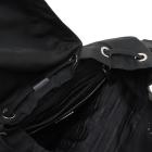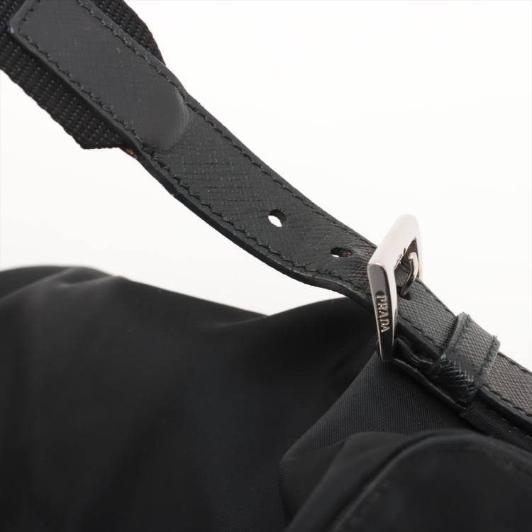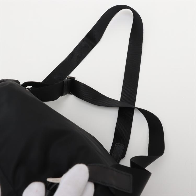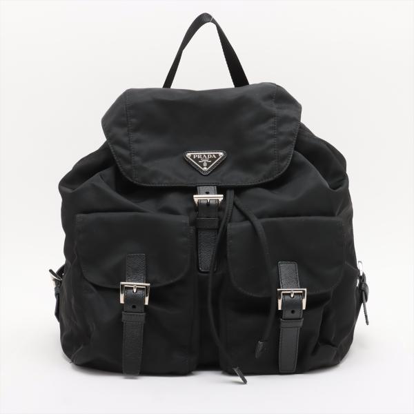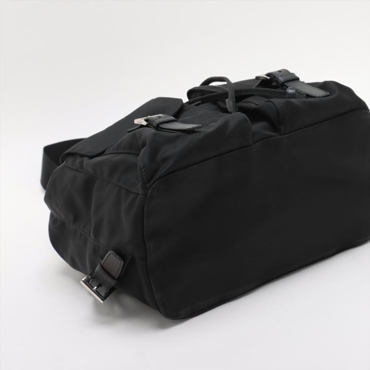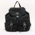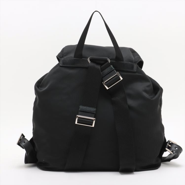 Prada Tessuto Vela backpack in black tessuto nylon and black smooth leather trim. Featuring silver-toned hardware, twin front exterior magnetic pockets, flat web top handle, dual adjustable web shoulder straps. The magnetic closure and flap open to a drawstring closure to a nylon logo-lined interior with a zip & patch pockets. Approximate dimensions: 29cm(L) x 30cm(H) x 15cm(D), handle drop 11cm, straps drop 38cm. With Entrupy Certificate of Authenticity. (Pre-owned)