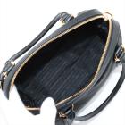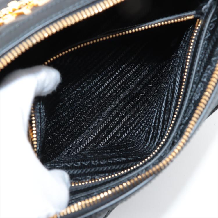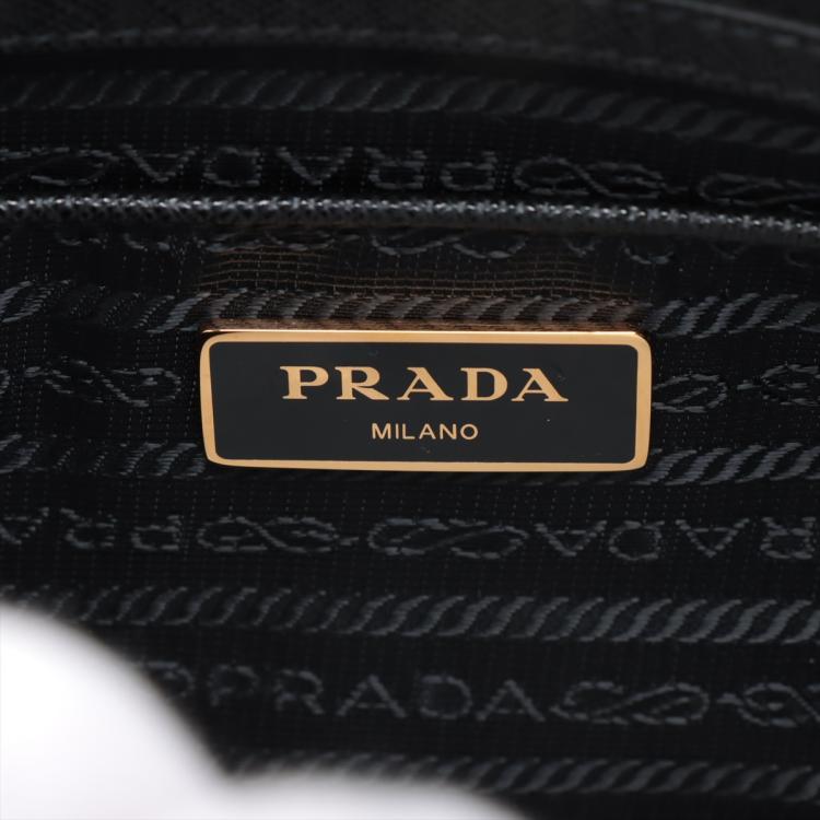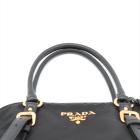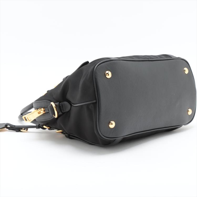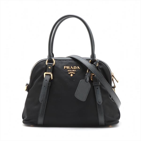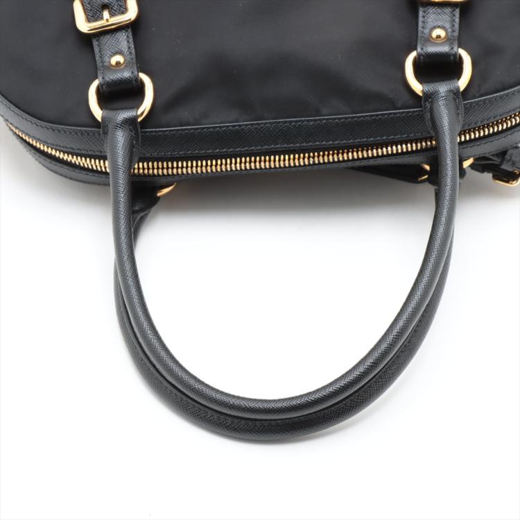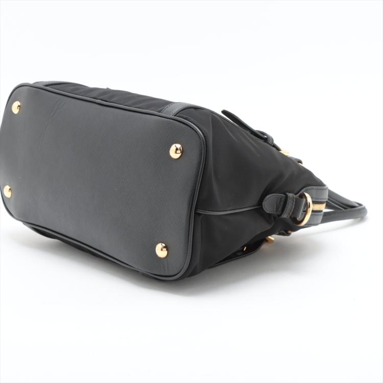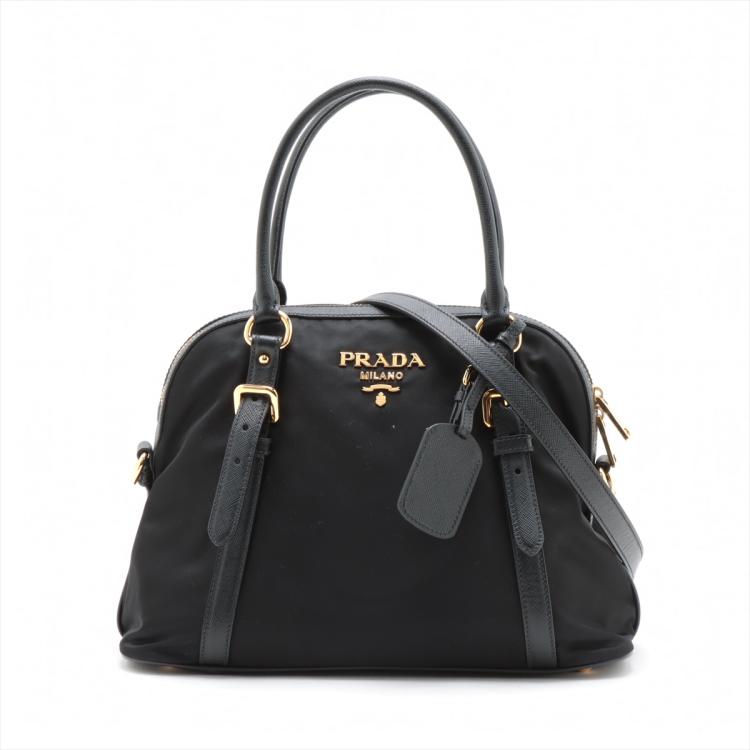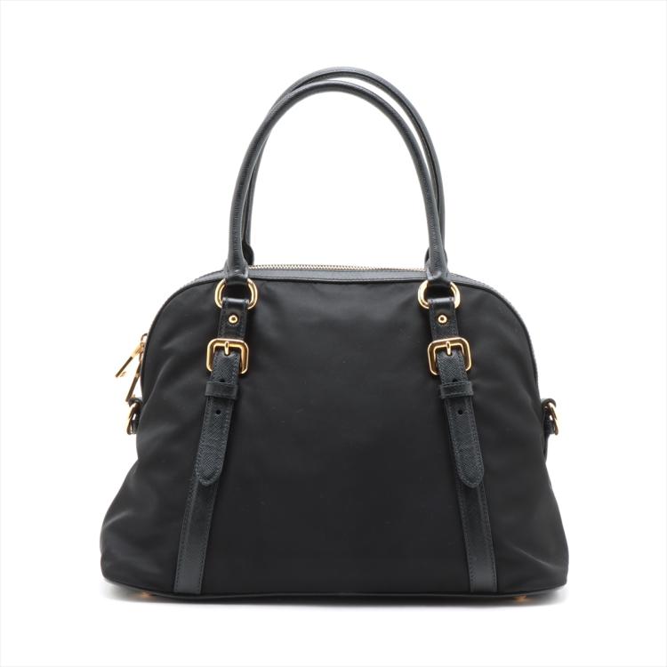 Prada Tessuto Handbag in black tessuto nylon and Saffiano leather lined trim. Featuring gold-toned hardware, adjustable handles with belt buckle, and nametag clochette. The dual zip closure opens to a black Prada-logo nylon interior with a zip and patch pockets. Approximate dimensions: 33cm(Base-L) x 23cm(H) x 14cm(D), handle drop 14cm, adjustable and detachable shoulder strap 47cm. Accompanied by Prada dustbag. With Entrupy Certificate of Authenticity. (Pre-owned)