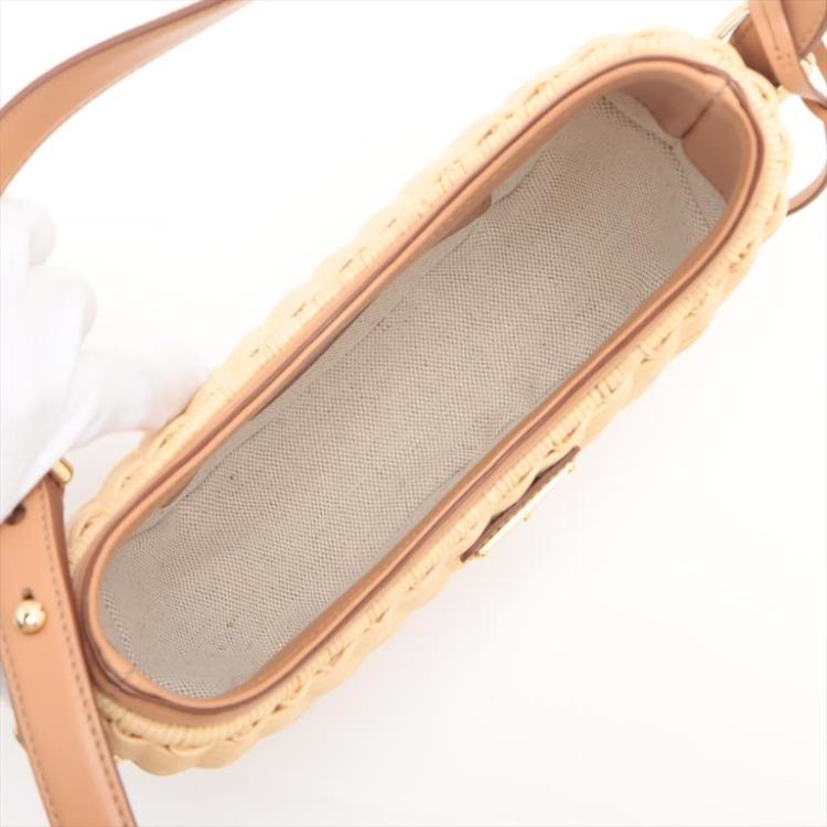 Prada Arque Bag in beige wicker, & with leather trim. Featuring gold-tone hardware, triangle logo plate at front, single leather handle, & a detachable leather shoulder strap. The open top reveals to a beige canvas lining interior with a patched pocket. Approx. dimensions: 23.5cm(L) x 20cm(H) x 7.5cm(D), 20 handle drop, adjustable, 61m shoulder height, adjustable. Accompanied by keyring in leather crochet & Prada dustbag. With Entrupy Certificate of Authenticity. (Pre-owned)