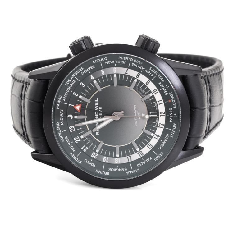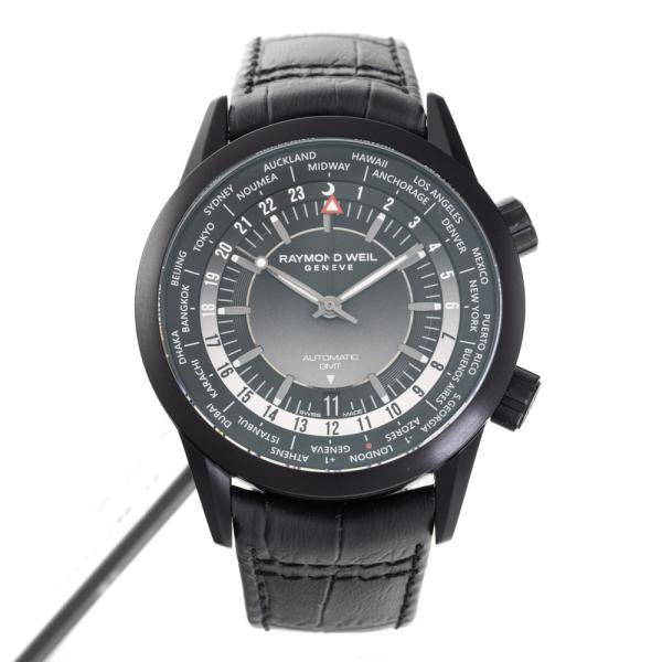 Raymond Weil Freelancer GMT Worldtimer stainless steel with black DLC coating automatic mens watch. Gradient black dial, day and night indication, date, case diameter: 40.5mm, strap length: 21.5cm, Swiss made. Ref# 2765-BKC-20001. With Raymond Weil black leather strap and clasp. With Undated Raymond Weil Guarantee card and Raymond Weil box. 12 month FSA warranty. (As new, Note: case on original wrap and minor wear strap due to being display stock).