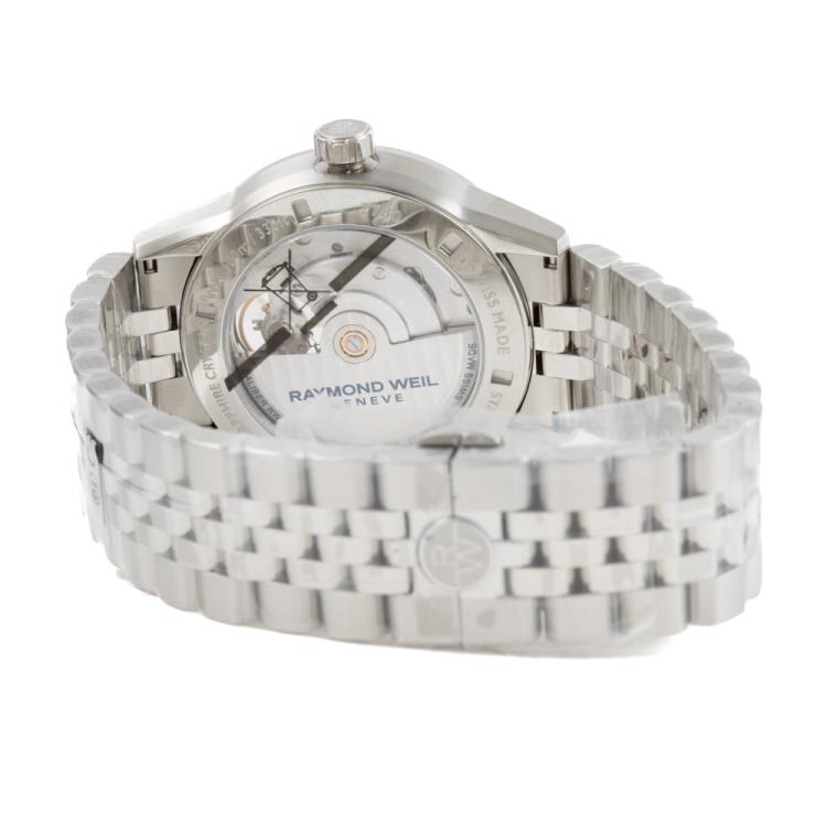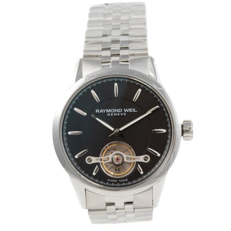 Raymond Weil Freelancer stainless steel automatic mens watch. Black dial, case diameter: 42mm, wrist size: 21.5cm, Swiss made. Ref# 2780-ST-20001. With Raymond Weil stainless steel bracelet and clasp. With Undated Raymond Weil Guarantee card and Raymond Weil box. 12 month FSA warranty. (As new, Note: case and bracelet on original wrap)